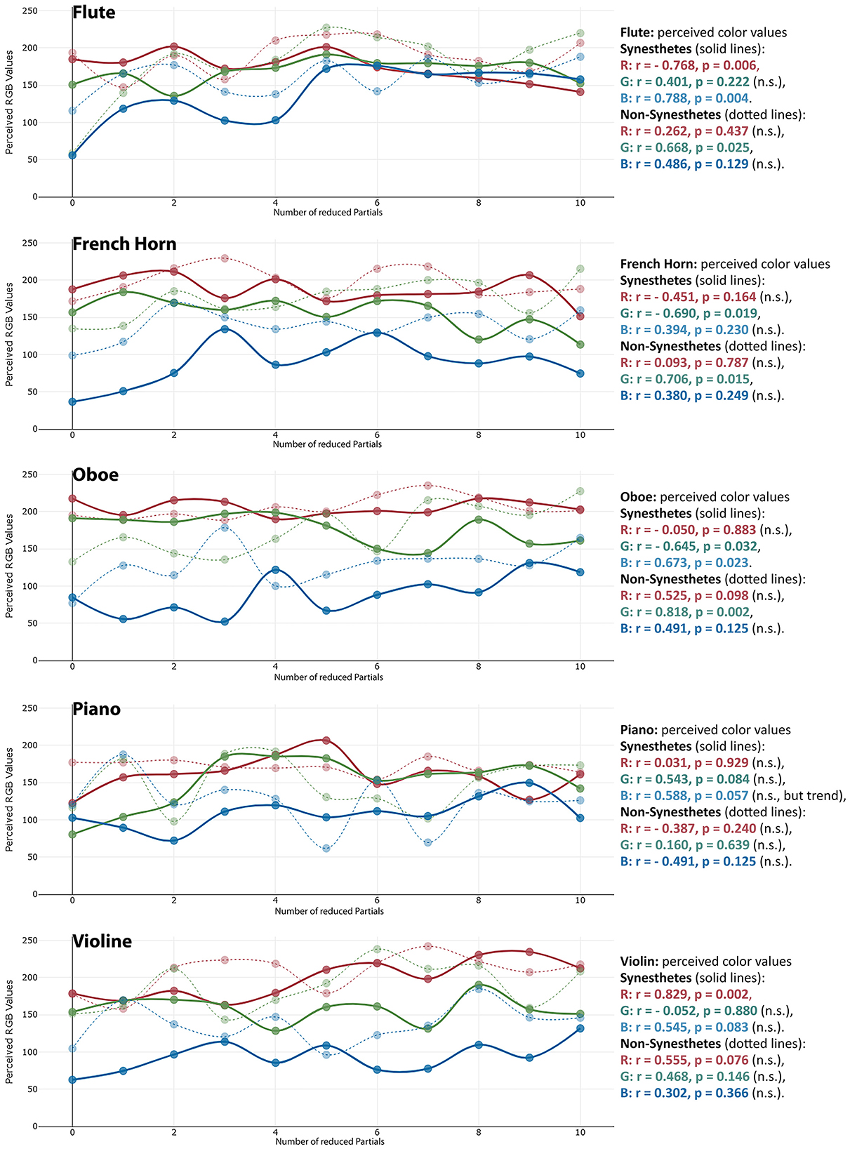Timbre-induced changes in hue differed between synesthetes and non-synesthetes. Among synesthetes, increasing the number of reduced partials primarily affected the red and blue components (flute, oboe, piano, violin). In contrast, non-synesthetes almost exclusively (and to a comparatively lesser extent) exhibited changes in the green components (flute, French horn, oboe).