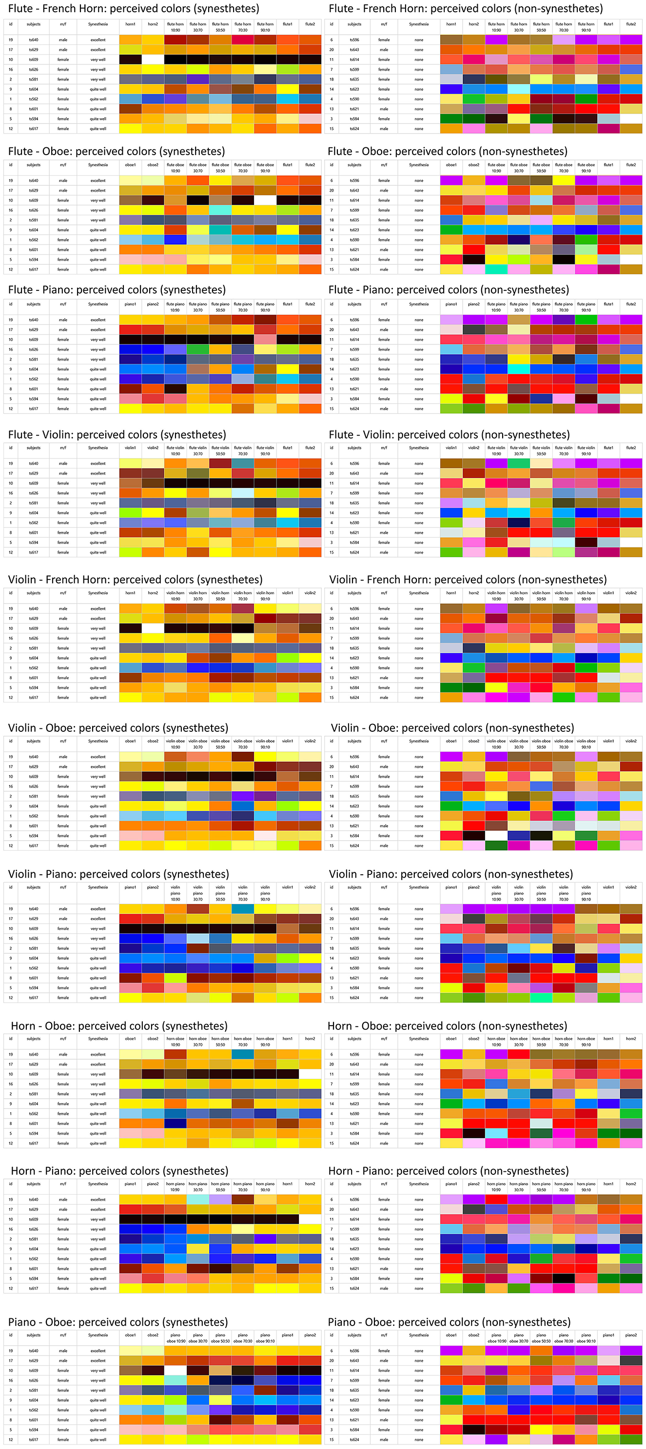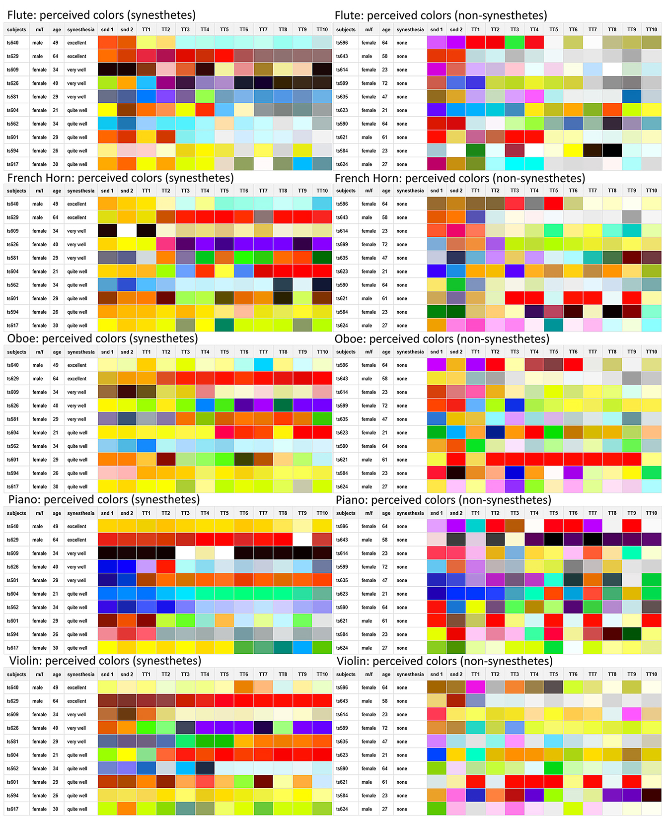 An online study was conducted with 20 timbre-color synesthetes (5 m, 15 f, aged from 21 to 72, Ø 41, SD: 16.9) recruited via the database of synesthetes at the School of Psychology, University of Sussex and German Synesthesia Association [“Deutsche Synästhesie-Gesellschaft (DSG)”]. The test subjects listened to loudness-matched individual sounds of flute, oboe, horn, violin and piano from the Vienna Symphonic Library (played on C4 in mf , 2 s duration) and their alterations presented in a randomly mixed order: Morphed sounds between two of the musical instrument timbres in the morph-ratios 100:0%, 90:10%, 70:30%, 50:50%, 30:70%, 10:90% and 0:100% between the respective sounds as well as partial-reduced variants of the five instrument timbres in which the lowest 10, 9, 8 etc. to 1 partial(s) in the spectrum were removed. The timbres have been morphed in different ratios with the VST plug-in MMorph from MeldaProductions; the partials have been removed with the spectral editor in Adobe Audition. The original sounds of the five musical instruments were played twice in random order to check whether the same sounds induced the same color perception in the synesthetes (= intra-rater reliability). The task of the test subjects was to select the timbre-induced color perception in a color selection field after each sound was heard, so that at the end of the study a corresponding color value in HSL (hue (chroma), saturation and lightness) was available for each sound.