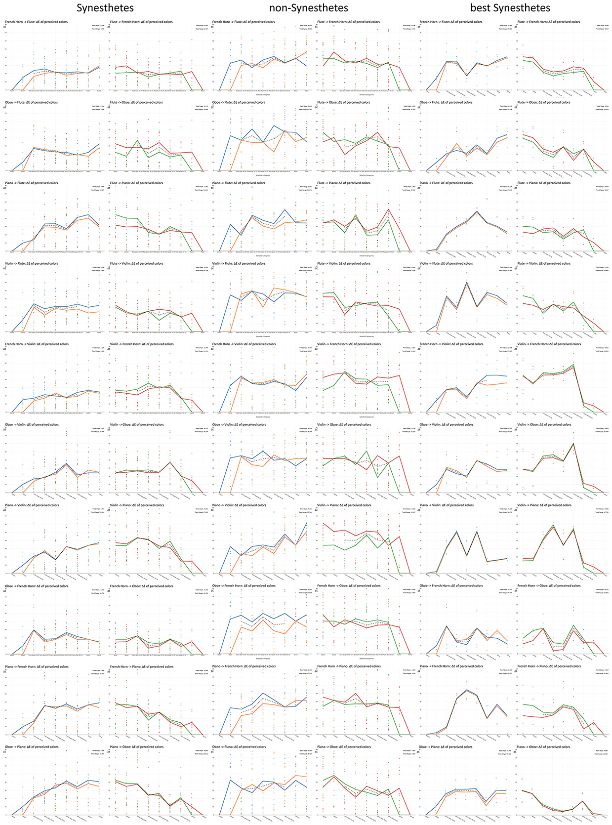 2. It can be seen that the two best synesthetes experienced much greater color differences on average than the synesthetes as a whole. Also, the synesthetes in turn experienced greater differences than the non-synesthetes (this can of course be explained by the fact that the trend curves already reflect the average color distance, which is more leveled out with 10 people than with 2, yet the color distances among synesthetes are more uniform than those among non-synesthetes). In many cases, the two best synesthetes showed a distinctive dip in the color distance in the middle of the curve (at a 50:50 morph), which suggests that a new instrument = a new color was perceived here. Also noteworthy here is the consistency in which the color distances of the morphed sounds to the colors of the original sounds were perceived by the two best synesthetes. This result is also reflected in the slopes and ranges of the individual trend lines (see Figure 5).