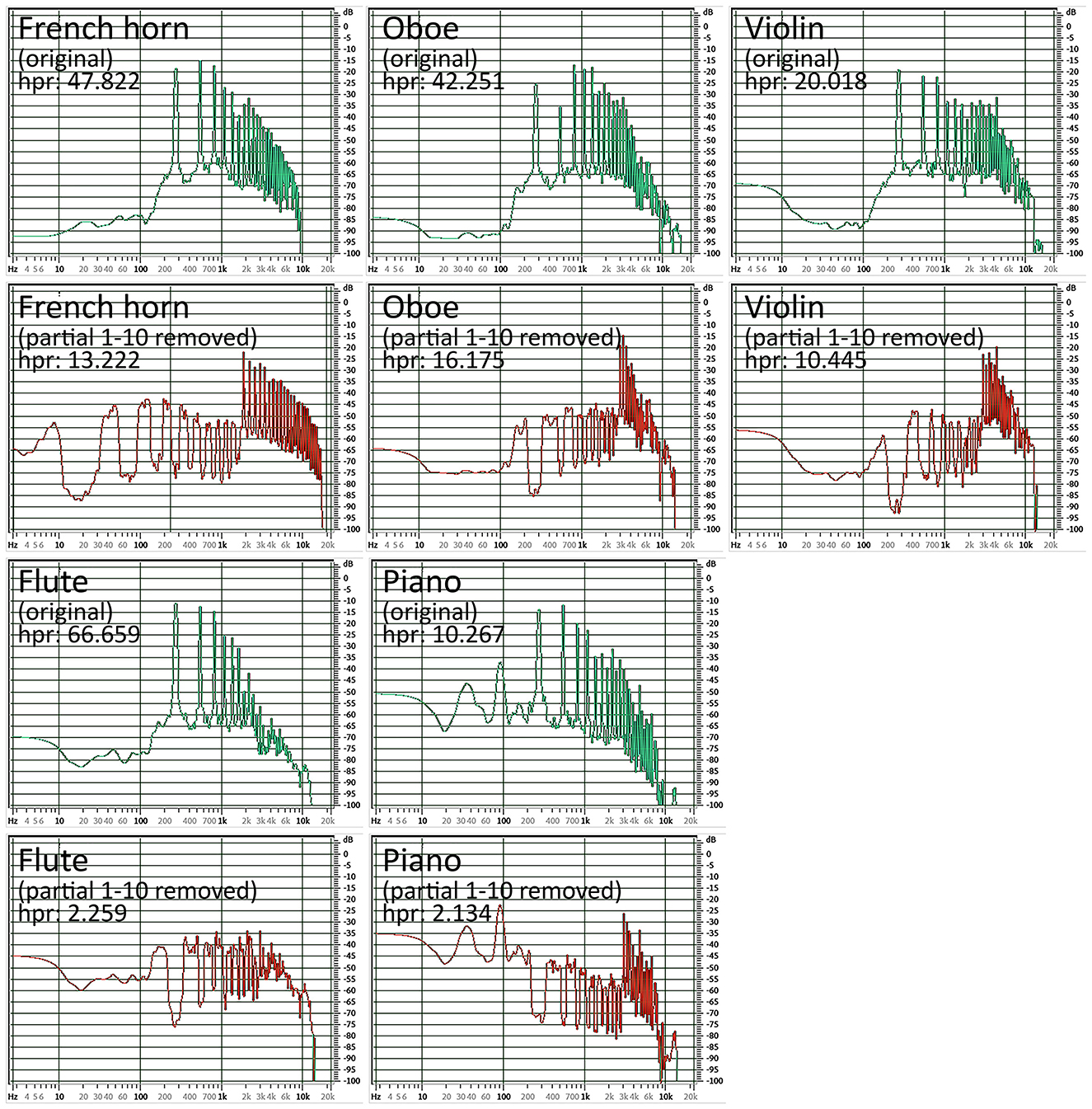 Since only partials were removed during the reduction process and not any blowing, bowing or striking noises in the corresponding frequency range, it can be assumed that audio features that describe the spectral shape as well as the relationship between tonal/harmonic and percussive components in the spectrum are primarily relevant for the timbre-induced perception of color. Thus, these three audio characteristics should be particularly suitable for a comparative audio signal analysis: