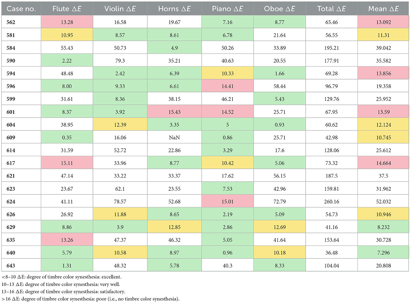 Table 1. Similarity of perceived colors in ΔE for the same sounds per test subject (case no.) as well as the mean ΔE (last column) as an indicator of the degree of timbre color synesthesia (green: < 8–10 ΔE, yellow: 10–13 ΔE, red: 13–16 ΔE).