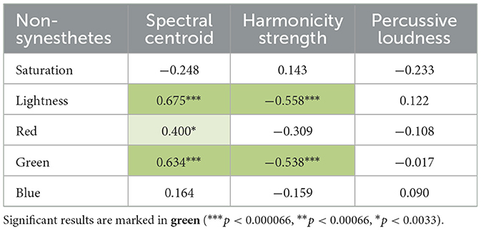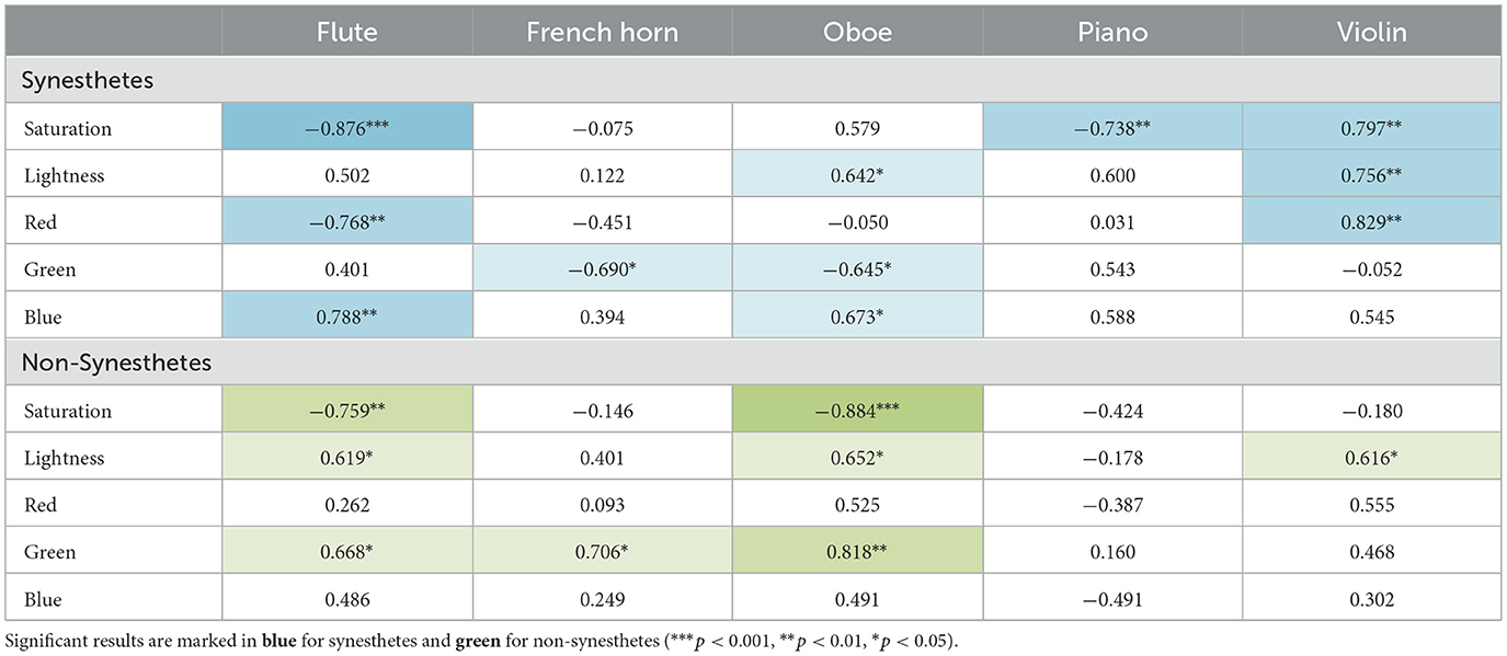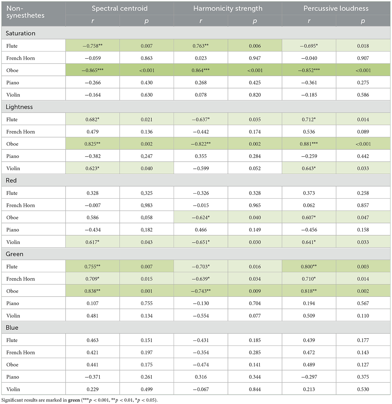 Looking at non-synesthetes on the other hand, comparable instrument-independent patterns could also be identified (see Table 4), even if they differed from those of synesthetes. Where lightness and blue components mainly appeared in synesthetes, patterns in non-synesthetes tended to rely on changes in saturation and green components. No significant correlations were found in the blue component range in this group (see Table 4), a trend which was already observed in colors of partial removed sounds (see Table 2).