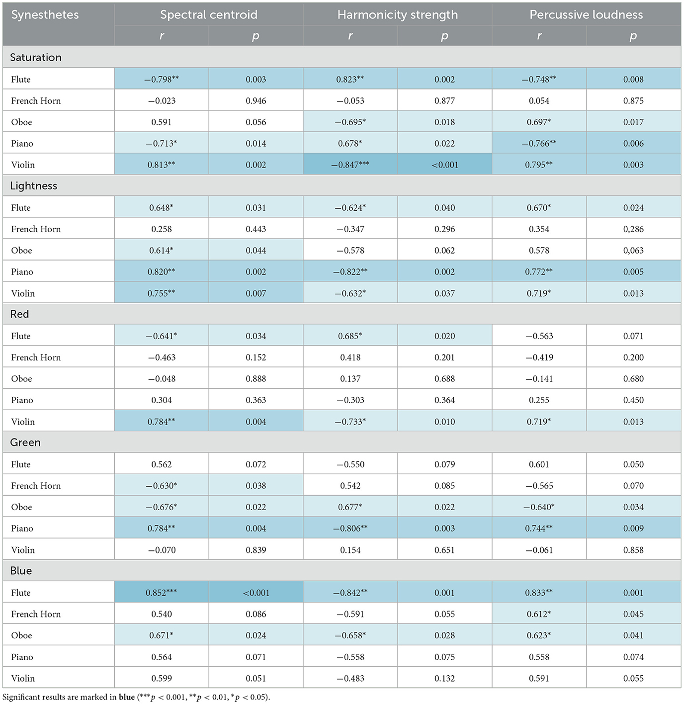 Table 8. Results of the Bonferroni-corrected (n = 3 * 5 = 15) correlation analysis between the changes in the audio features (as a consequence of the morphing stage) in relation to the values of the colors perceived by timbre-color synesthetes.