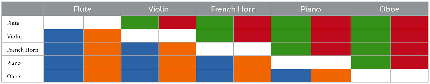 1. ^You can find all timbre-induced color impressions of the test subjects to the original instruments in the supplementary material at https://muwiserver.univie.ac.at/synesthesia/.