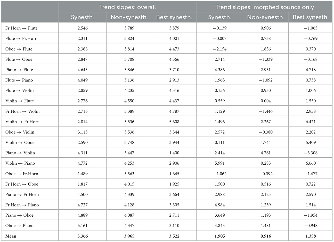 Table 6. Slope of the trend lines for the individual morph combinations, for synesthetes, non-synesthetes, and best synesthetes, both in their totality (left) and only for the morphed sounds (right).