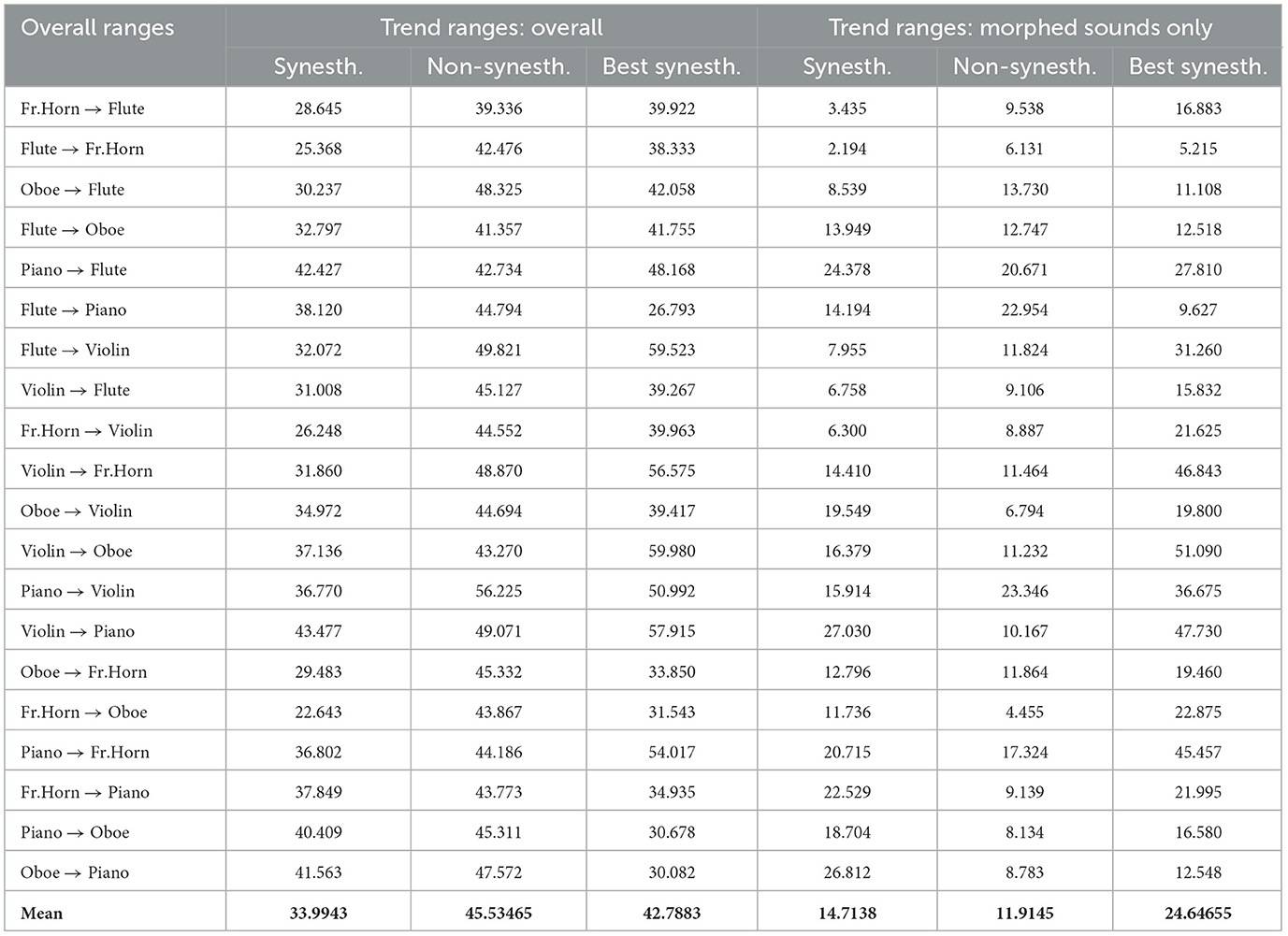 Table 7. Range of the trend lines for the individual morph combinations, for synesthetes, non-synesthetes, and best synesthetes, both in their totality (left) and only for the morphed sounds (right).