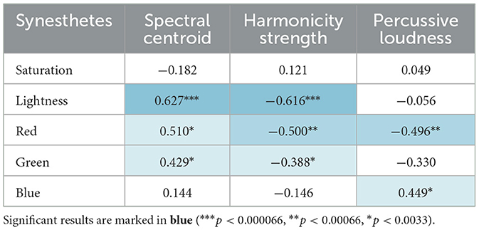 Table 9. Results of the Bonferroni-corrected (n = 3 * 5 = 15) correlation analysis between the changes in the audio features (as a consequence of the morphing stage) in relation to the values of the colors perceived by non-synesthetes.