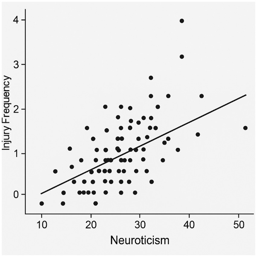 A Poisson regression model was conducted with psychological traits as predictors of injury frequency, including neuroticism, AAQ-II, conscientiousness, and STAI, while controlling for age and sex. Neuroticism [Exp (β) = 1.15, p = 0.026] and psychological inflexibility [Exp (β) = 1.09, p = 0.041] emerged as significant positive predictors. Conscientiousness showed a trend toward a protective effect [Exp (β) = 0.92, p = 0.074], while anxiety, age, and sex were not significant. The relationship between neuroticism and injury frequency is visually depicted in Figure 1.