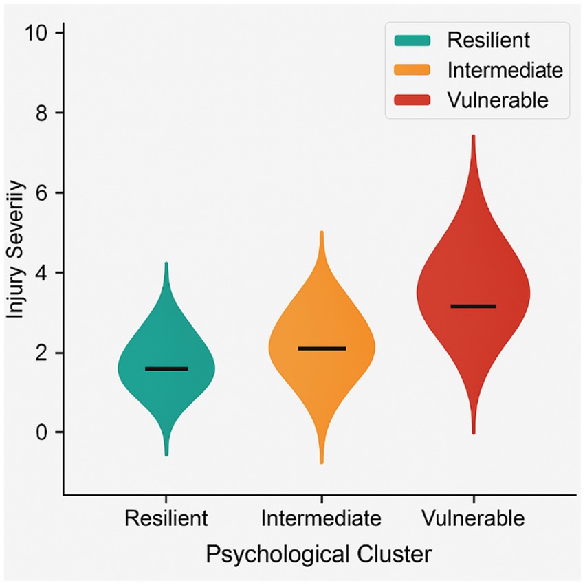 Group comparisons showed significant differences in injury frequency (F = 4.21, p = 0.018) and injury severity (F = 5.02, p = 0.012), with the Vulnerable group exhibiting the highest values. These severity differences are presented in Figure 2.