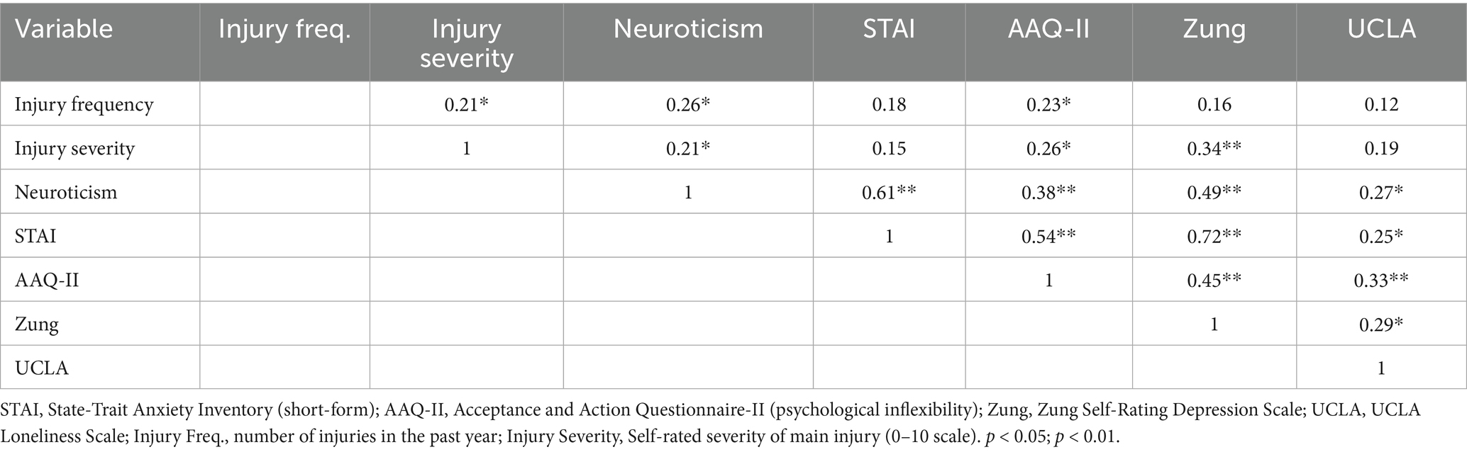 Descriptive statistics were computed for all psychological and injury-related variables. The sample showed moderate mean levels of neuroticism (M = 3.9 ± 1.0), anxiety (STAI short-form: M = 14.6 ± 4.3), psychological inflexibility (AAQ-II: M = 19.8 ± 7.2), loneliness (UCLA: M = 5.1 ± 1.5), and depressive symptoms (Zung: M = 34.7 ± 8.6). The average number of injuries reported in the previous year was 2.3 ± 1.9, with a mean severity of 5.1 ± 2.4 (on a 0–10 scale). Pearson correlation analyses revealed significant associations between neuroticism and depression (r = 0.49, p < 0.001), anxiety (r = 0.61, p < 0.001), psychological inflexibility (r = 0.38, p < 0.01), and loneliness (r = 0.27, p < 0.05). Injury frequency was significantly correlated with neuroticism (r = 0.26, p = 0.032) and AAQ-II scores (r = 0.23, p = 0.041). These relationships are summarized in Table 1.