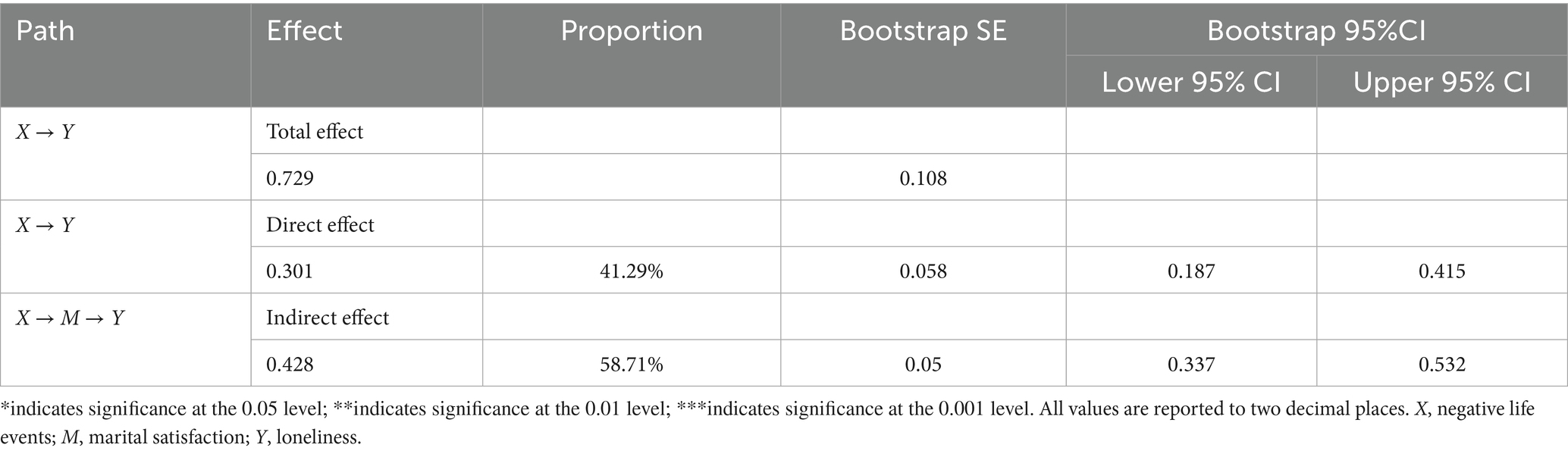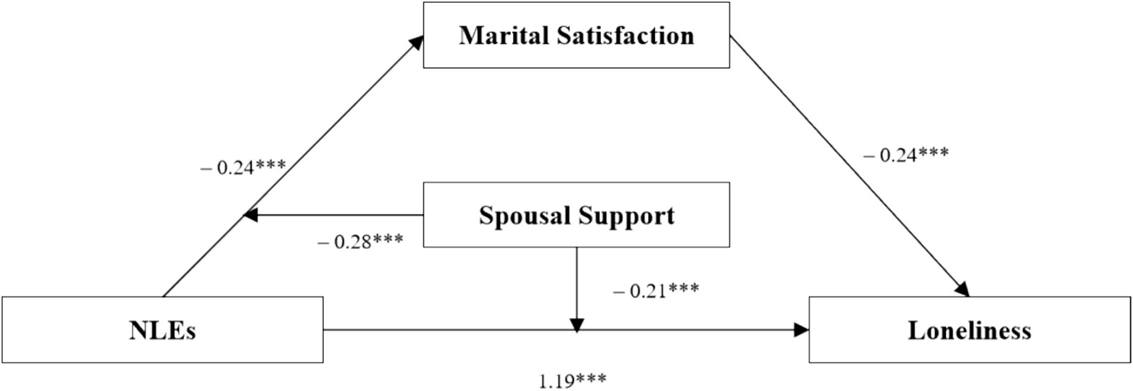 Building upon this theoretical framework and empirical basis, we propose that NLEs not only directly undermine marital quality but may also indirectly exacerbate loneliness through the mediating role of MS. Although prior research has separately documented the erosive effects of NLEs on MS and the protective effects of MS against loneliness, the dynamic interplay between these three constructs remains underexplored. The unique vulnerability of marital systems in old age—exacerbated by physiological decline and shifting social roles—heightens susceptibility to disequilibrium following adverse events. Such disruptions may simultaneously disrupt marital equilibrium and weaken conjugal buffering against loneliness through declining MS. Consequently, we advance our second hypothesis: MS partially mediates the relationship between NLEs and loneliness in older adults (H2). Specifically, negative events directly shape marital evaluations while simultaneously undermining the marital relationship (a primary source of social support) thereby amplifying perceptions of social isolation and loneliness.
