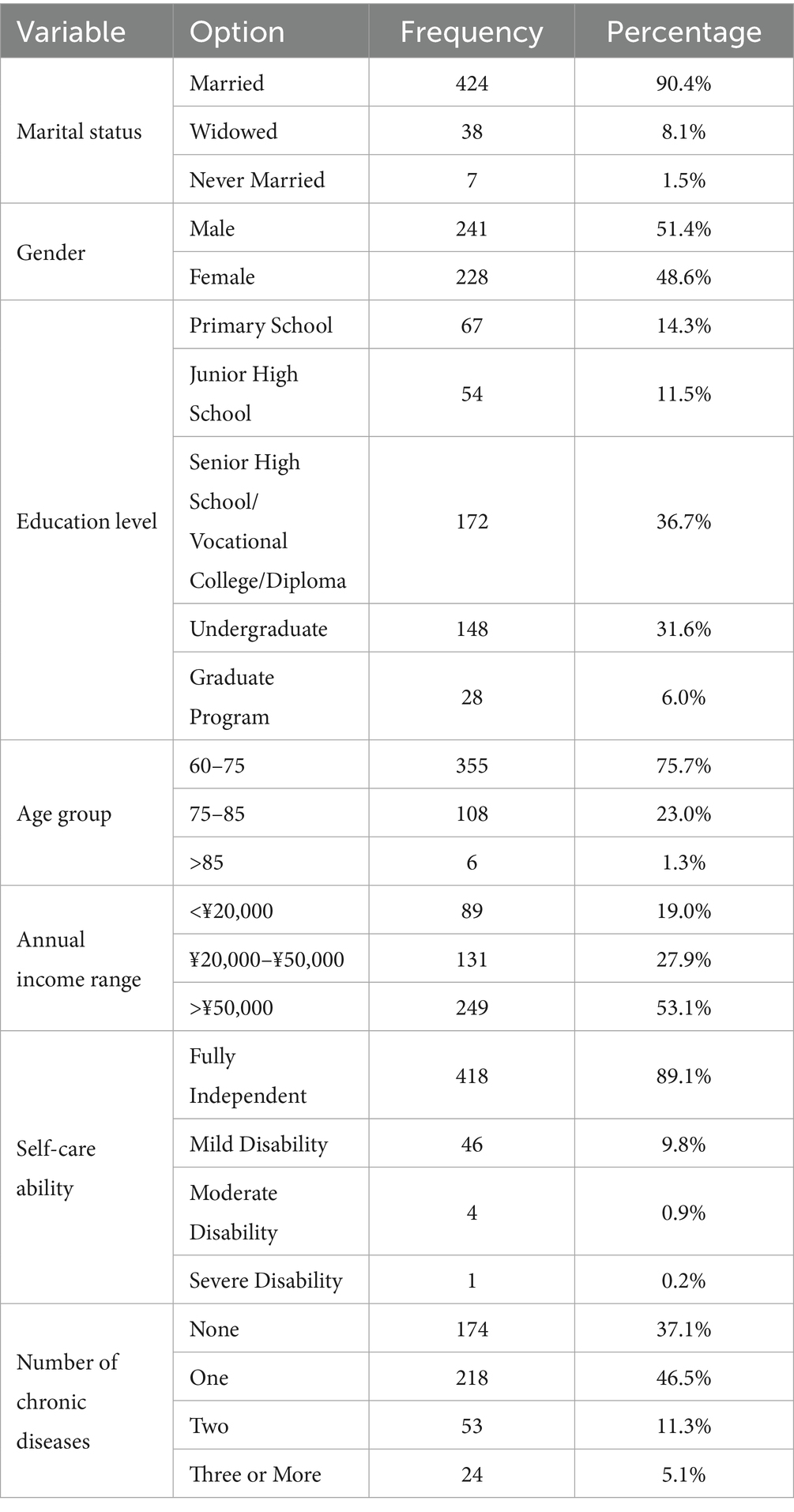 Participants were recruited through community service centers and senior activity organizations via convenience sampling, with inclusion criteria set at age ≥60 years. Because the core variable examined in this study was marital satisfaction, only currently married older adults were included. Individuals who were widowed, divorced, or never married were excluded after questionnaire completion. Inclusion criteria were: (1) aged ≥ 60 years; (2) able to complete the questionnaire independently or with minimal assistance. Exclusion criteria were: (1) serious hearing or speech impairments that prevented comprehension; (2) refusal to sign the informed-consent form. This study was approved by the Institutional Review Board of Qufu Normal University, and all participants provided written informed consent before completing the survey. The initial sample consisted of 500 older adults. Considering the common visual impairments among the elderly population, this study adopted an assisted data collection method. Specifically, volunteers who had undergone systematic training would read out the questionnaire content to the participants word for word, and then accurately record the participants’ verbal responses on the questionnaire. Rigorous quality control excluded 31 invalid responses based on predefined criteria: logical contradictions within responses; omission of critical items (with individual item non-response rates exceeding 15%); internally inconsistent multiple-choice selections; and evidence of non-substantive responding (e.g., identical scaling across items). Pre-defined data-quality criteria were applied before analysis: (1) Item response rate: missing items ÷ total items per scale; if any core scale (NLEs, UCLA, marital satisfaction, or partner support) had ≥ 15% missing, the whole questionnaire was discarded. (2) Completion time: recorded from survey opening to submission; questionnaires taking > 30 min were excluded. After applying the exclusion criteria, 469 usable questionnaires remained, representing 93.8% of the 500-person sample. Of the 469 participants, 241 identified as male (51.4%) and 228 as female (48.6%). Key demographic characteristics—including age distribution, highest level of educational attainment, and geographic region—are presented in Table 1.