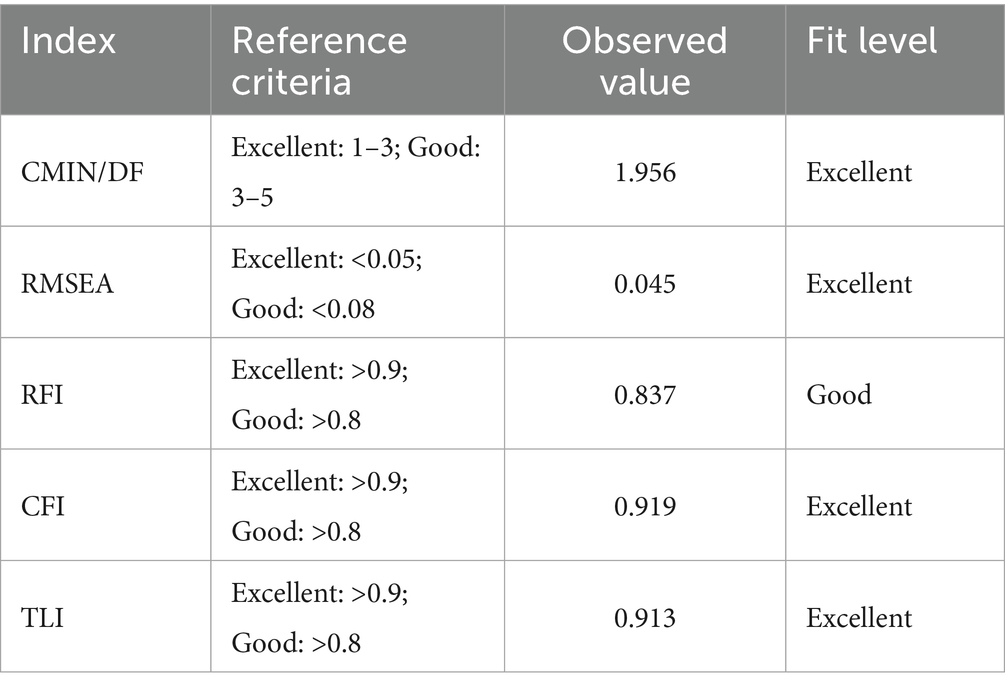 Common method bias was evaluated using Harman’s single-factor test. Results indicated nine eigenvalues exceeding 1, with the largest factor accounting for 24.06% of variance (below the 40% threshold), suggesting no substantial common method variance. Subsequent confirmatory factor analysis (CFA) using AMOS 24.0 yielded satisfactory model fit indices: χ2/df = 1.956 (<3), RMSEA = 0.045 (<0.05), CFI = 0.919 (>0.9), TLI = 0.913 (>0.9), and RFI = 0.837 (>0.8). These metrics collectively meet established criteria for structural equation models, demonstrating adequate fit between the theoretical model and observed data (Table 2).