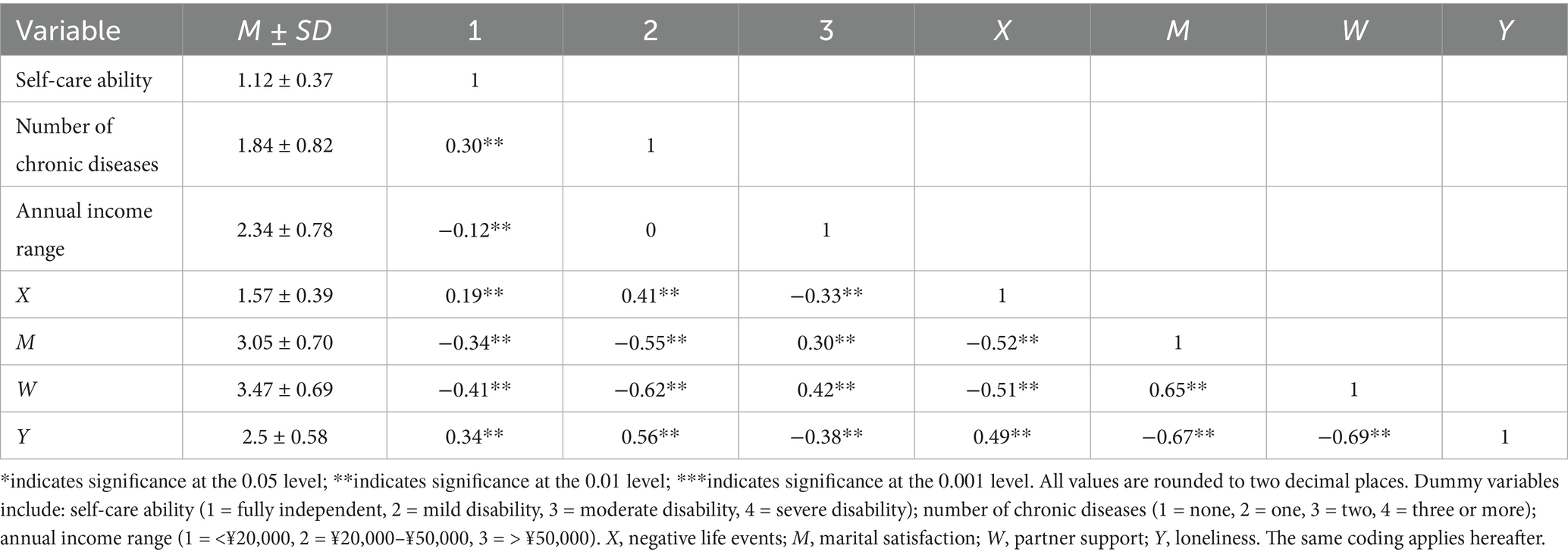 Hierarchical multiple regression analyses were conducted using SPSS Macro Model 8 to examine the moderating role of partner support in the association between NLEs (independent variable) and loneliness (dependent variable). We focused on the pathway from NLEs (X) to loneliness (Y), specifying MS (M) as a mediator and partner support (W) as a moderator (detailed results in Table 5).