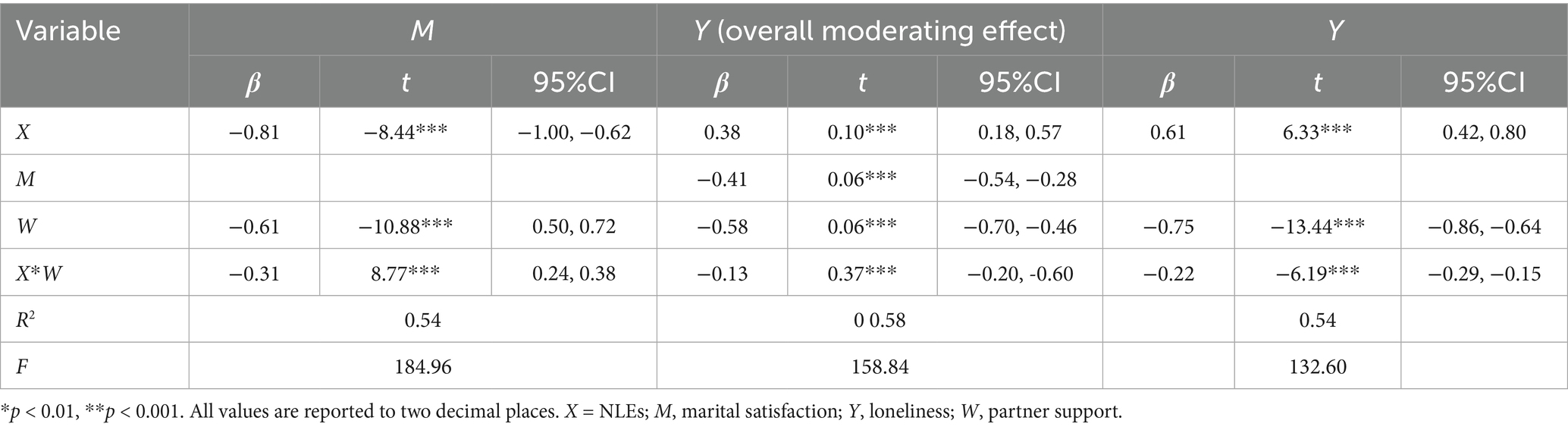 For the MS (M) model, NLEs (X) exerted a significant negative effect (β = −0.81, t = −8.44, p < 0.001), and partner support (W) similarly showed a significant negative effect (β = −0.61, t = −10.88, p < 0.001). The interaction term (X × W) significantly positively predicted MS (β = −0.31, t = 8.77, p < 0.001), suggesting that partner support negatively moderates the link between NLEs and MS. This model accounted for 54% of variance (R2 = 0.54, F = 184.96, p < 0.001).