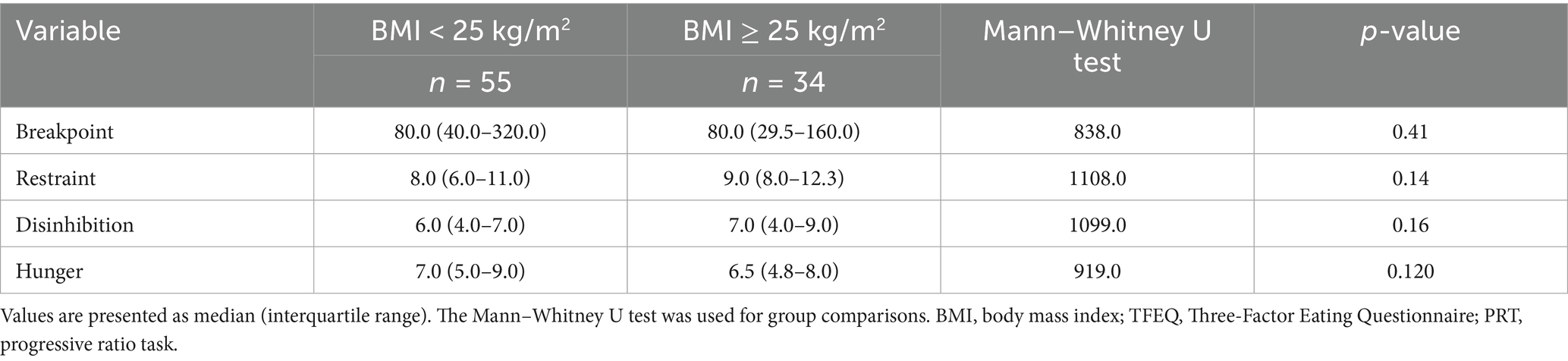 Table 2 presents the results of the Mann–Whitney U test comparing the breakpoint from the PRT and the scores of the TFEQ subscales between the high and low BMI groups. Participants with a BMI < 25 kg/m2 had a median breakpoint of 80.0 (interquartile range: 40.0–320.0), comparable to those with a BMI ≥ 25 kg/m2 [80.0 (interquartile range: 29.0–160.0); U = 838.0, p = 0.41]. Similarly, no significant differences were observed in restraint, disinhibition, and hunger scores.