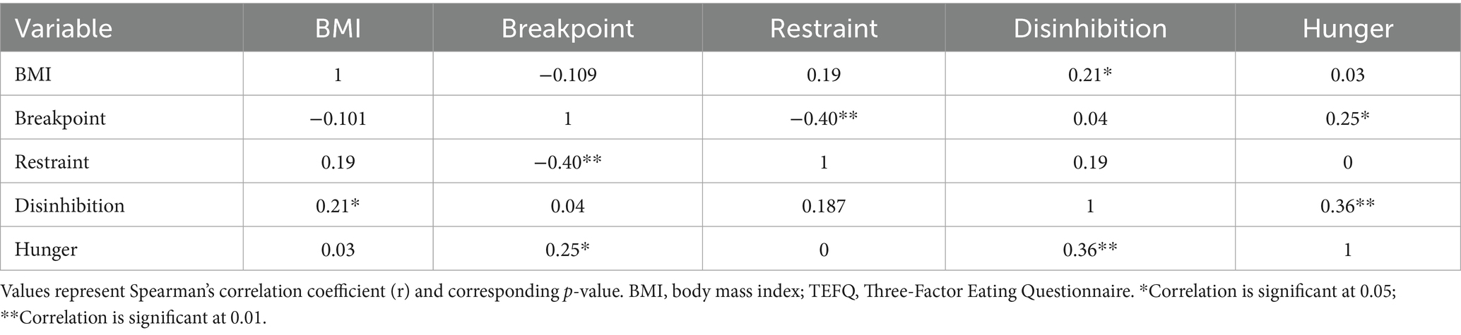 Table 3. Spearman’s rank correlation coefficient matrix of BMI, breakpoint, and TFEQ subscale scores.