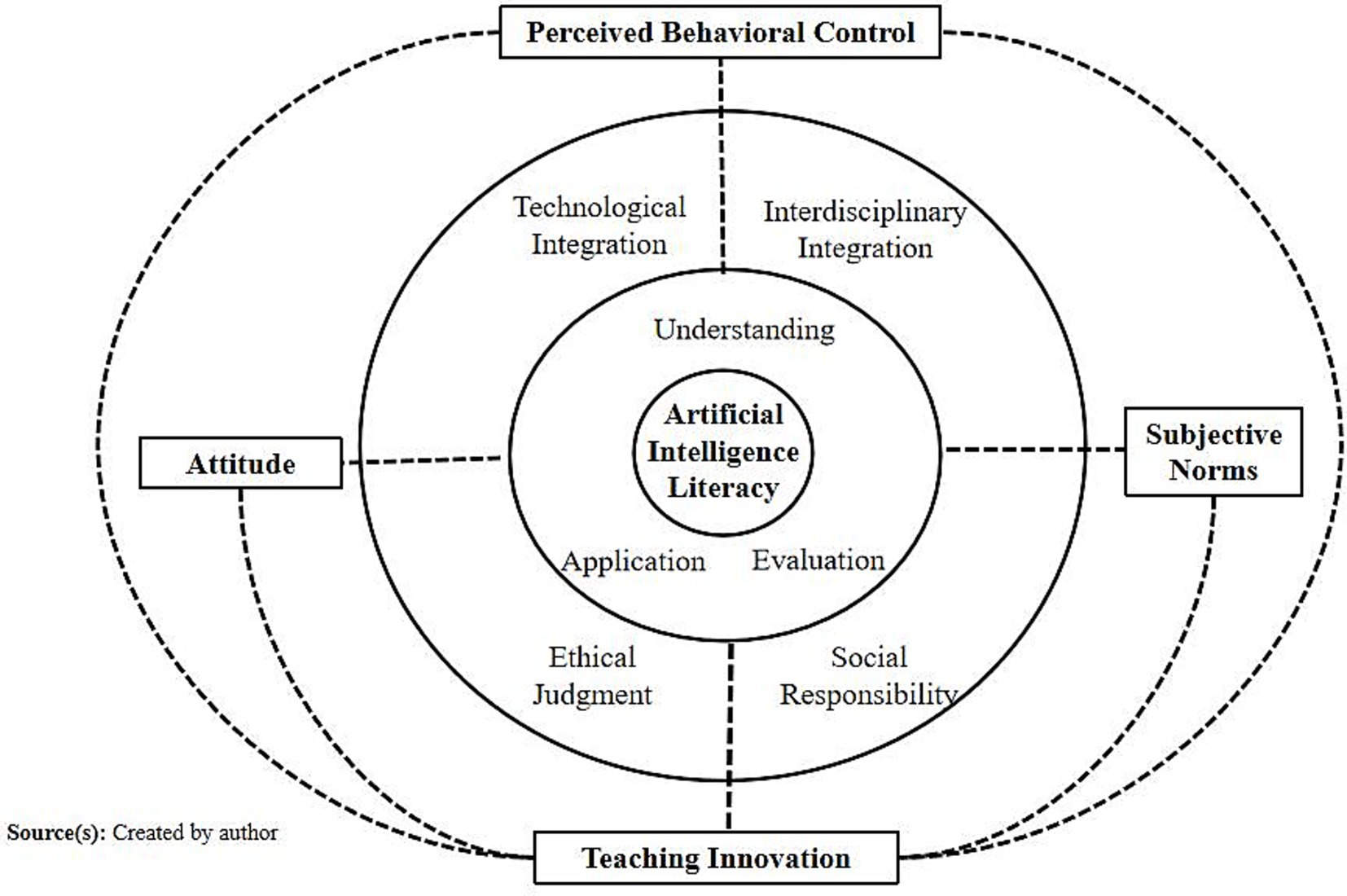 Empirical studies have further validated the relationship between AI literacy and teaching innovation. Research indicates that AI literacy can not only directly promote innovative practices by enhancing teachers’ technical proficiency but also indirectly foster innovation by shaping positive cognitive attitudes, strengthening the perception of social expectations, and boosting self-efficacy (Ivanov et al., 2024). Table 1 systematically reviews the latest research on AI and digital technologies in teaching innovation, providing a solid foundation for the construction of this study’s model. Building on this, Figure 1 presents the evolution and application framework of AI literacy: its core is composed of the initial definitions (understanding, application, evaluation), with extensions to dimensions such as technological integration, interdisciplinary collaboration, ethical judgment, and social responsibility. These literacy components influence teaching innovation through the three psychological mechanisms of TPB—attitudes, subjective norms, and perceived behavioral control—forming a logical chain of “AI Literacy—TPB Psychological Mechanisms—Teaching Innovation” that lays a systematic foundation for the theoretical model of this study.