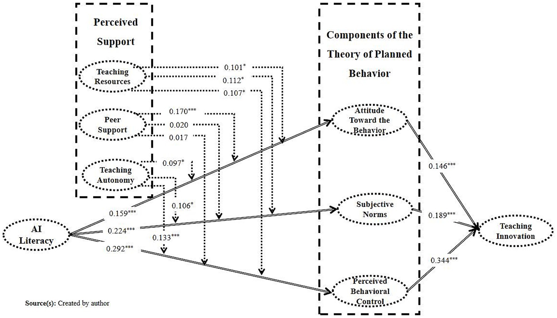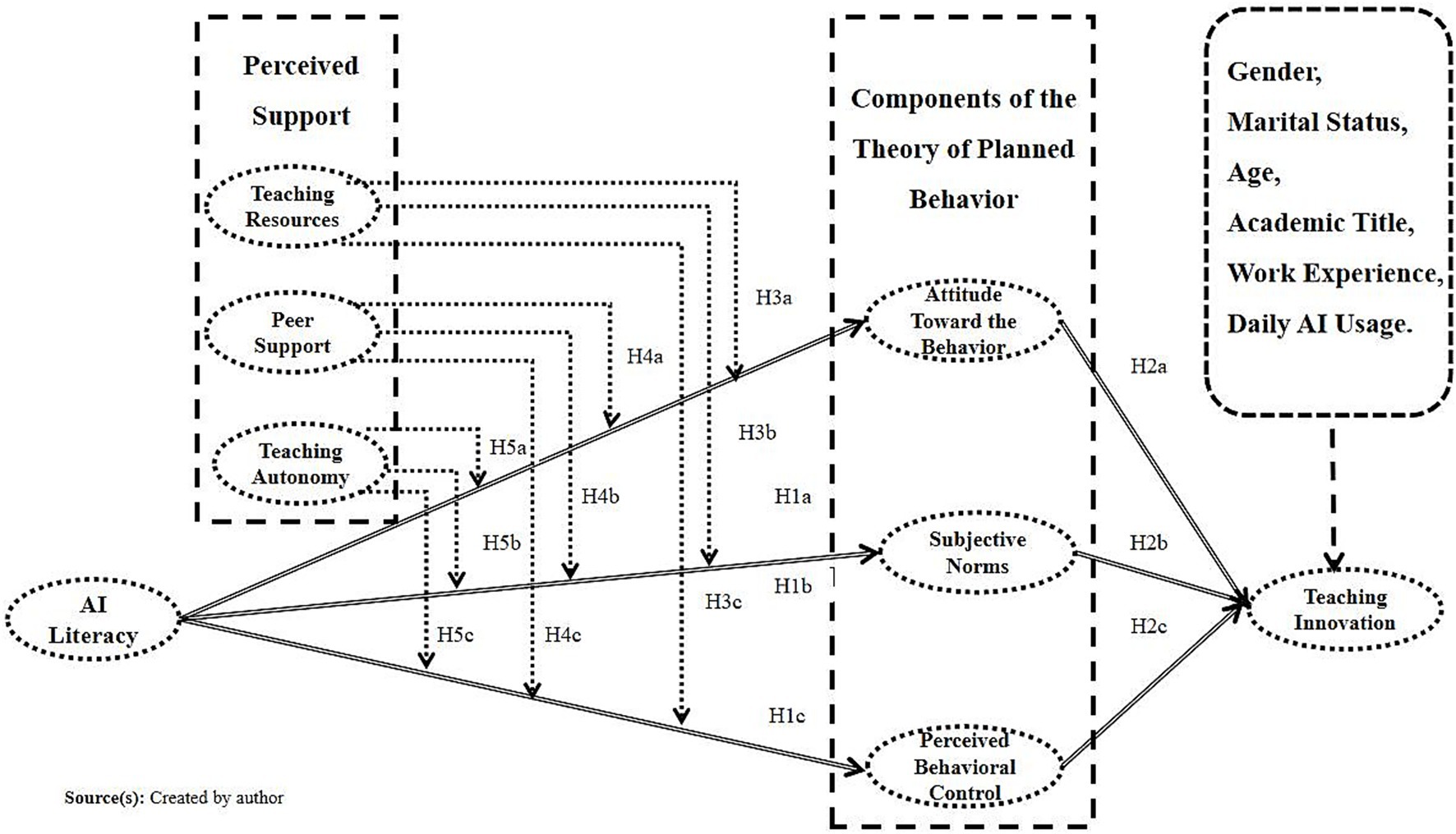 The Theory of Planned Behavior (TPB) provides a solid psychological framework for understanding teachers’ innovative behaviors (Zhang, 2025). According to this theory, an individual’s behavioral intentions are primarily determined by behavioral attitude, subjective norm, and perceived behavioral control (Dunn et al., 2018). AI literacy may influence teachers’ attitudes toward the educational value of AI, their perception of external expectations, and their confidence in their abilities, thereby promoting teaching innovation (Kong et al., 2024). At the same time, external supportive conditions cannot be overlooked in this process (Adabor et al., 2025). Perceived support theory posits that educational resources, peer support, and teaching autonomy enhance motivation and foster creative behaviors (Han et al., 2021). Educational resources provide material support for teachers to explore new methods, peer support stimulates motivation through collaborative exchange, and teaching autonomy creates institutional space for trying innovations (Cai and Tang, 2022; Hornstra et al., 2021; Nshimiyimana and Cartledge, 2020). Research has shown that a supportive environment can amplify the positive psychological and behavioral effects of an individual’s capabilities (Wang et al., 2025). Thus, external situational support may moderate the impact of AI literacy on teachers’ attitudes, subjective norms, and perceived control, indirectly influencing their level of teaching innovation.