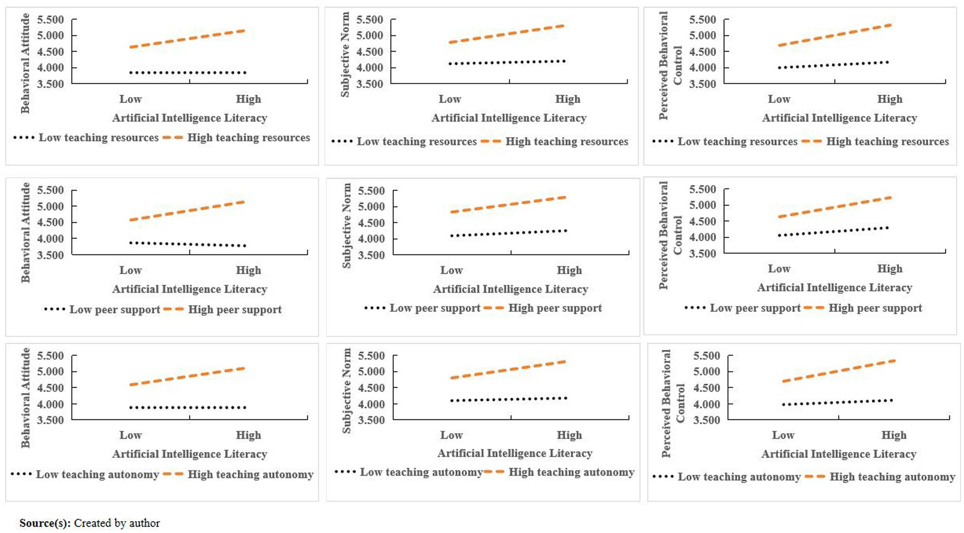 Figure 3 illustrates the moderating effects of teaching resources, peer support, and teaching autonomy on the relationships between AI literacy and teachers’ behavioral attitude, subjective norm, and perceived behavioral control. Teaching resources showed significant positive moderating effects on all three paths. As the level of teaching resources increased, the influence of AI literacy on behavioral attitude ( ), subjective norm ( ), and perceived behavioral control ( ) strengthened, supporting hypotheses H3a, H3b, and H3c. This indicates that sufficient teaching resources provide perceived support for teachers and further enhance their positive attitudes and beliefs in the use of emerging technologies (Hazzan-Bishara et al., 2025).