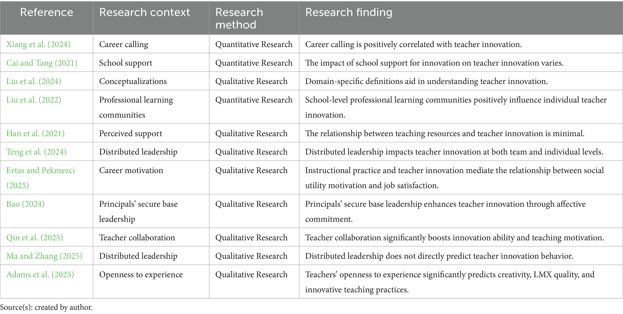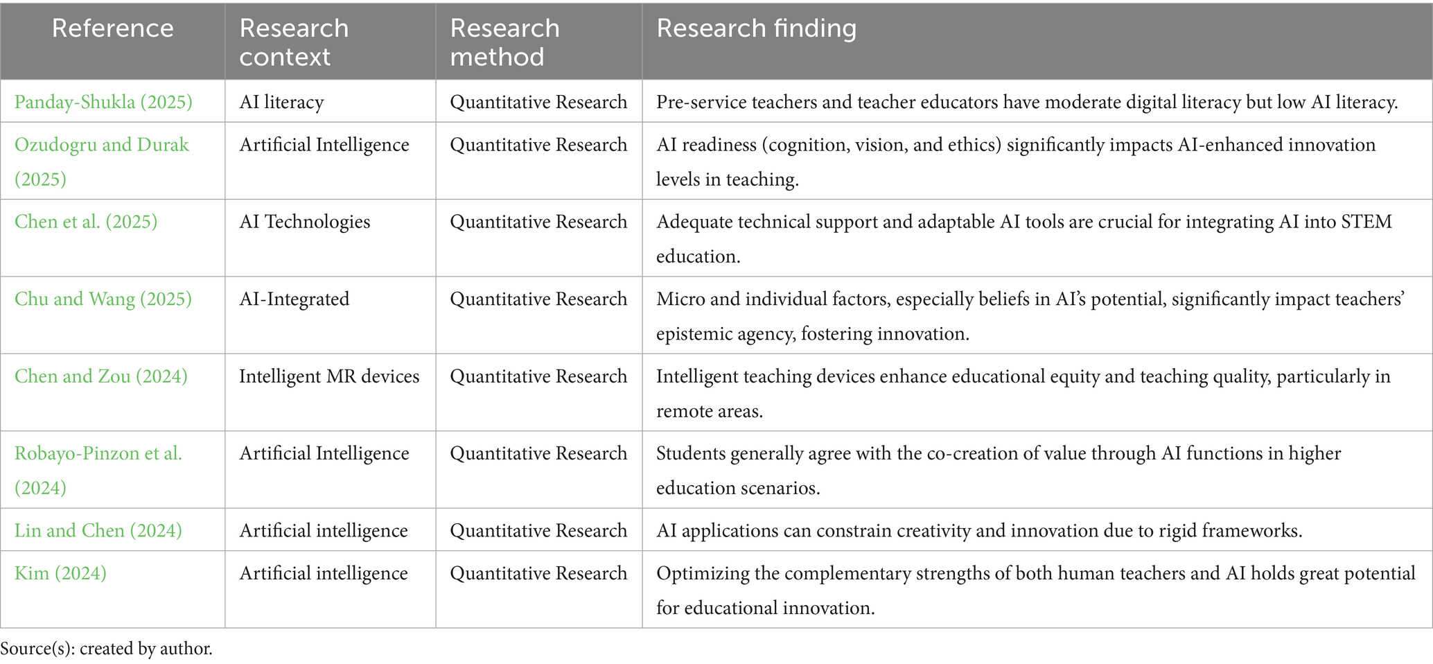 Existing research generally agrees that teaching innovation is influenced by both individual and contextual factors (Kottmann et al., 2024). On the individual level, a teacher’s knowledge structure, innovation awareness, and technical abilities determine the likelihood of implementing changes in their teaching (Chen, 2024). On the contextual level, institutional support, peer collaboration, and technological environments have been identified as key conditions for promoting teaching innovation (Mokhlis and Abdullah, 2024). In recent years, the widespread application of AI has further expanded the boundaries of teaching innovation. It not only provides tools like learning analytics and intelligent feedback but also facilitates the paradigm shift from a “teacher-centered” to a “learner-centered” model (Chou et al., 2025). However, teachers still face challenges in advancing innovation, including insufficient AI literacy, limited teaching autonomy, and uncertainty about new teaching models (Gupta and Bhaskar, 2020). Table 2 summarizes the latest research on teaching innovation, covering the research context, methods, and key findings. These results indicate that teacher innovation relies both on individual cognition and attitudes and on the important influence of external support environments. This lays the foundation for exploring the “AI literacy—TPB psychological mechanisms—teaching innovation” pathway in this study.