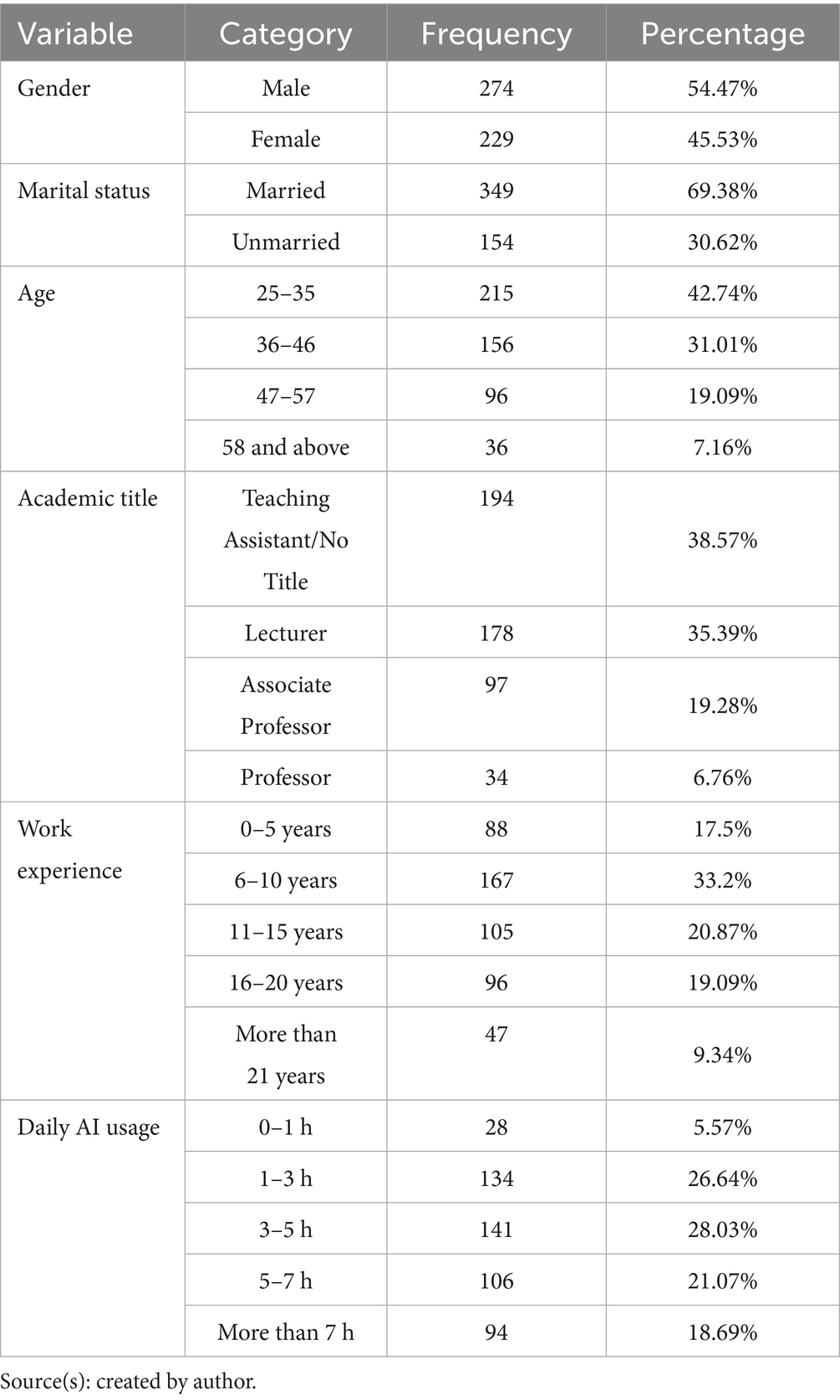 The data for this study were collected online via the Wenjuanxing platform,1 using a seven-point Likert scale. To ensure sample relevance, two mandatory screening questions were placed at the start: (1) Occupational identity (only university teachers); (2) Experience using AI tools (must answer “Yes”). Respondents failing either screen were blocked from proceeding to the main questionnaire. Data cleaning followed a pre-specified process to ensure quality and consistency: (1) Duplicate response detection was performed, and surveys with duplicate responses from the same IP address or device were checked and excluded to avoid redundancy; (2) Response consistency was examined, and surveys where all items were answered with the same option were excluded; (3) Incomplete responses were removed. In total, 518 questionnaires were collected. After applying these criteria, 15 responses were excluded, resulting in 503 valid responses (effective response rate 97.1%). The valid sample represents a variety of universities across the country. The gender distribution was fairly balanced, with the majority of participants aged between 25 and 46 years. The sample included assistant professors, lecturers, associate professors, and professors, with years of experience ranging from 0–5 years to over 20 years. Most teachers reported using AI tools for more than 1 h daily, with some using them for over 5 h. Common platforms included ChatGPT, DeepSeek, Sora, and Wenxin Yiyan, indicating the widespread integration of AI in teaching and research practices. The demographic characteristics of the participants are shown in Table 3.
