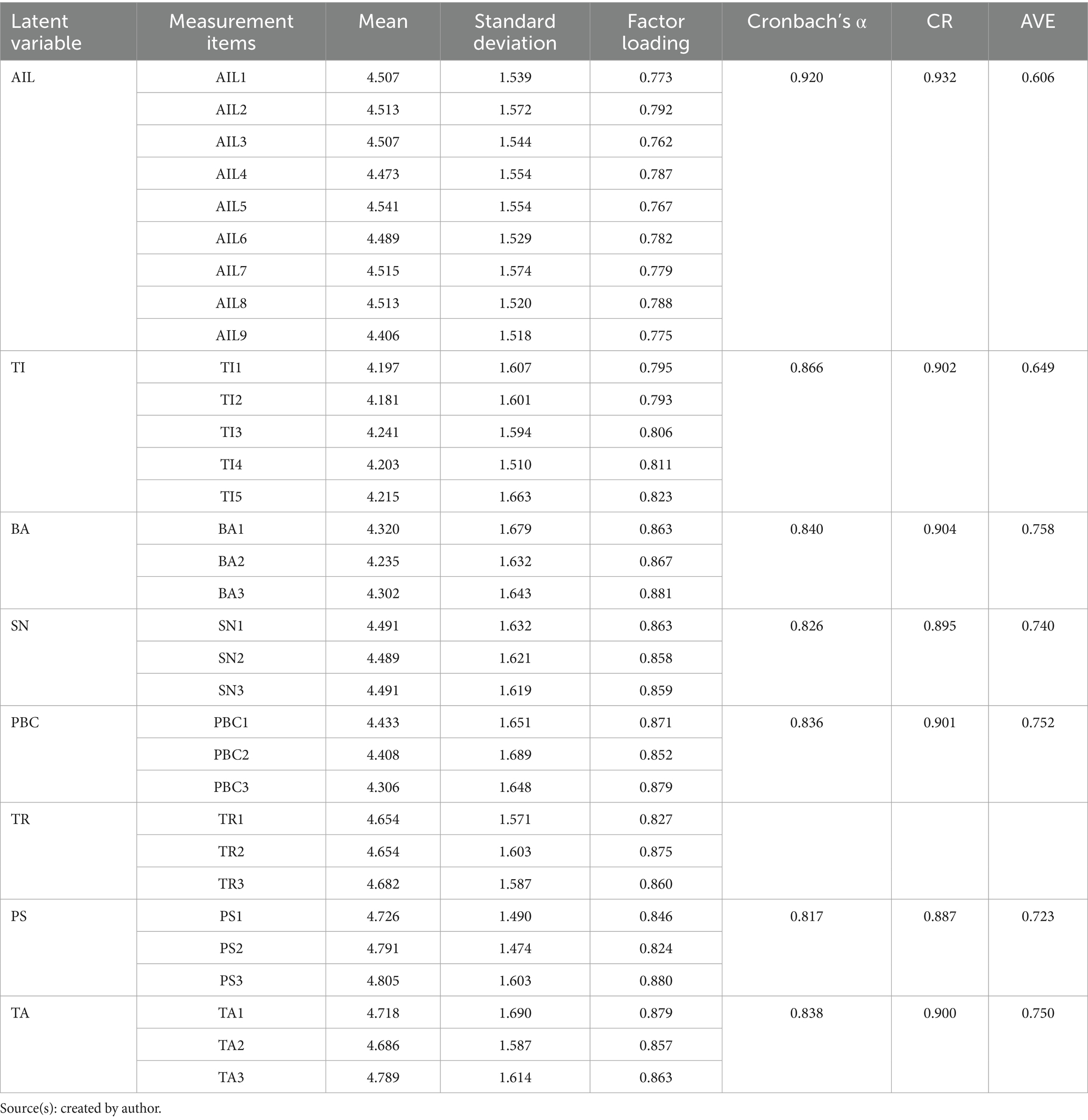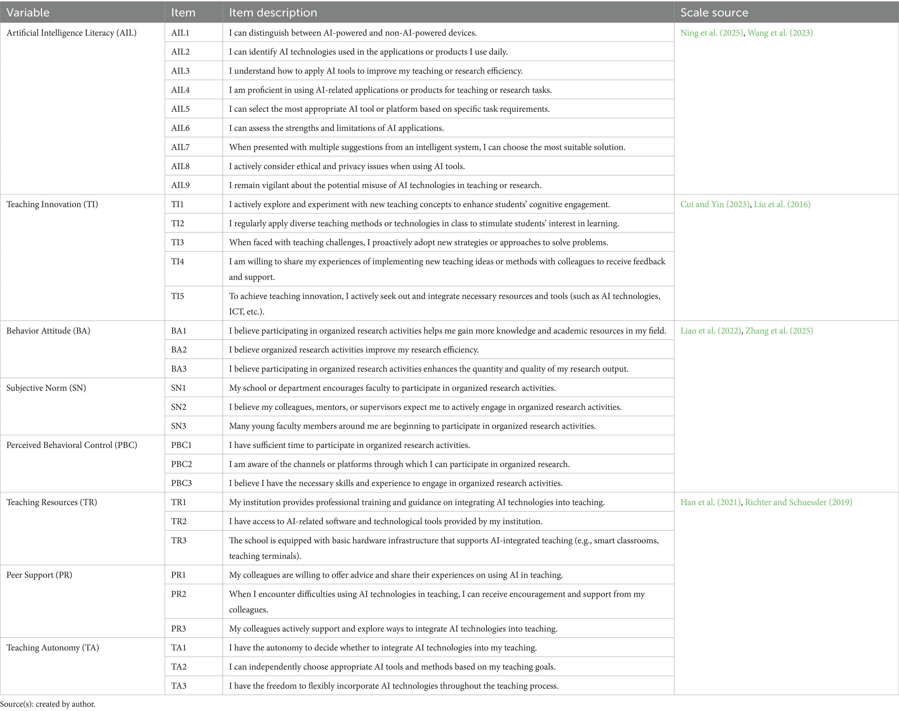 This study utilized established scales that have been empirically validated both domestically and internationally, with modifications made to suit the context of university teachers (Cui and Yin, 2023; Han et al., 2021; Liao et al., 2022; Liu et al., 2016; Ning et al., 2025; Richter and Schuessler, 2019; Wang et al., 2023; Zhang et al., 2025). All items were rated using a seven-point Likert scale (1 = strongly disagree, 7 = strongly agree), with higher scores indicating higher levels on each dimension. The measurement covered eight core variables: AI literacy (9 items, assessing teachers’ abilities to recognize, apply, evaluate AI tools, and their awareness of ethical risks), teaching innovation (5 items, reflecting practices such as exploring new ideas, applying diverse teaching methods, problem-solving, sharing experiences, and integrating resources), behavioral attitude (3 items, measuring teachers’ positive cognitive responses to organized teaching and research activities), subjective norm (3 items, reflecting social expectations from the department, colleagues, and academic groups), perceived behavioral control (3 items, addressing factors such as time, channels, and self-efficacy), teaching resources (3 items, evaluating institutional support for training, tools, and hardware facilities), peer support (3 items, reflecting experience sharing, encouragement, and collaboration among colleagues), and teaching autonomy (3 items, reflecting teachers’ freedom in decision-making related to the integration of AI in teaching). The specific items and scale sources for each variable are listed in Table 4.