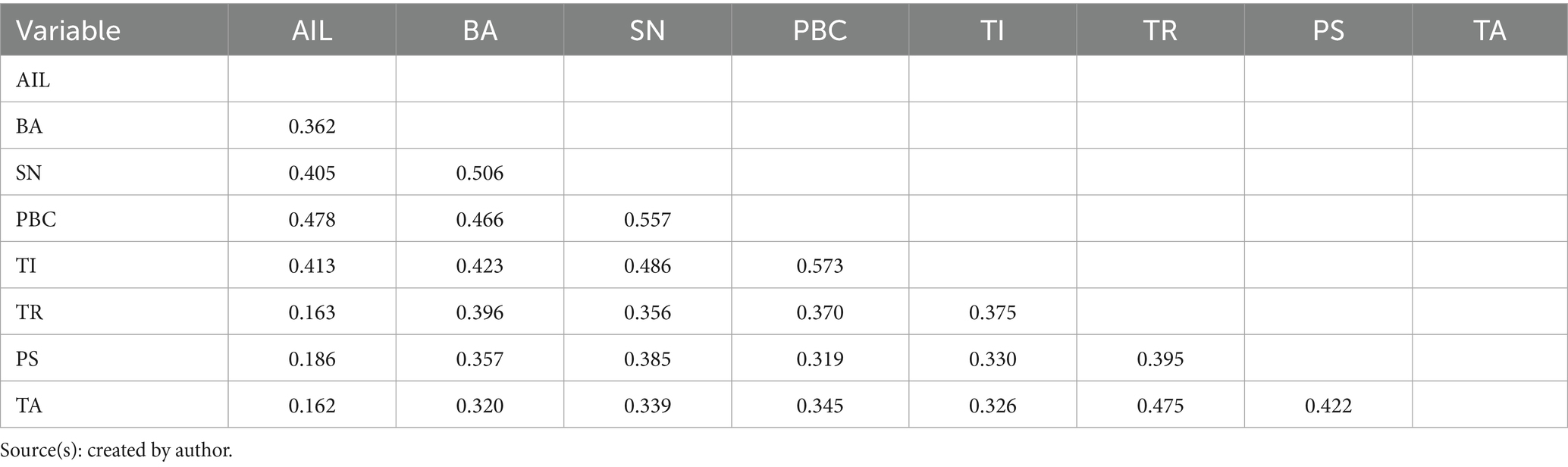 To control for potential confounding effects, demographic variables such as gender, marital status, age, academic title, work experience, and AI usage duration were included as control variables (Cui and Yin, 2023; Jose et al., 2025; Zhao et al., 2022). The analysis indicated that these control variables did not have a significant impact on the main relationships, specifically the relationships between AI literacy, the components of the Theory of Planned Behavior (behavioral attitude, subjective norm, and perceived behavioral control), and teaching innovation. This suggests that the main relationships between AI literacy and teaching innovation are not influenced by these demographic factors, and the results are consistent across different population subgroups.