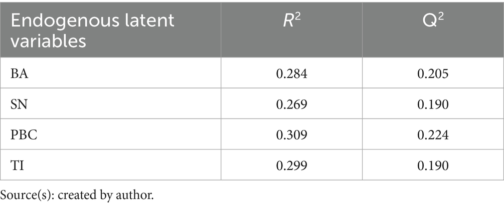 Table 7 displays the explanatory power and predictive relevance of the structural model. The results indicated that the R2 values for the endogenous variables ranged from 0.269 to 0.309, indicating that the exogenous variables explained a substantial portion of the variance in the endogenous constructs. Additionally, the Stone-Geisser Q2 values for all endogenous variables were greater than zero (ranging from 0.190 to 0.224), suggesting strong robustness and reliability of the model in out-of-sample predictions. Overall, these results support the model’s rationality from both explanatory power and predictive relevance perspectives, further highlighting its theoretical value (Sarstedt et al., 2020; Shmueli et al., 2019).