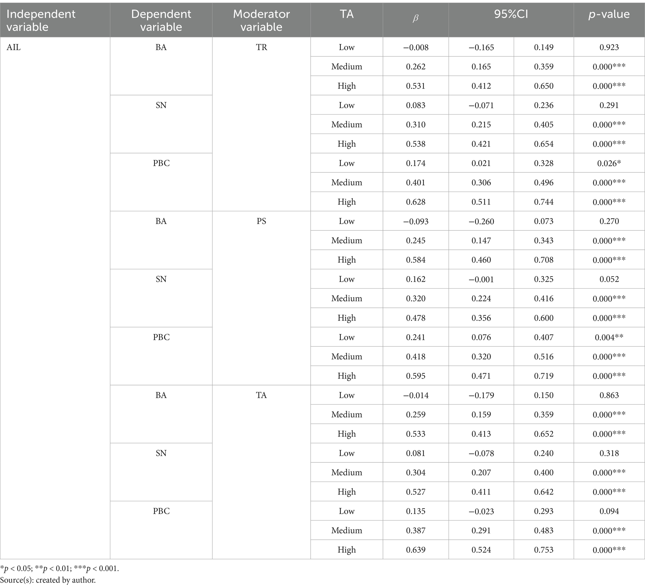 Teaching autonomy exhibited significant positive moderating effects on all three paths. The higher the teaching autonomy, the stronger the impact of AI literacy on behavioral attitude ( ), subjective norm ( ), and perceived behavioral control ( ), supporting hypotheses H5a, H5b, and H5c. This result emphasizes the key role of teaching autonomy in fostering technology adoption and innovation practices, indicating that empowerment and decision-making autonomy effectively stimulate teachers’ proactivity and initiative in applying AI technologies (Bali et al., 2025; Hou and Shen, 2024).