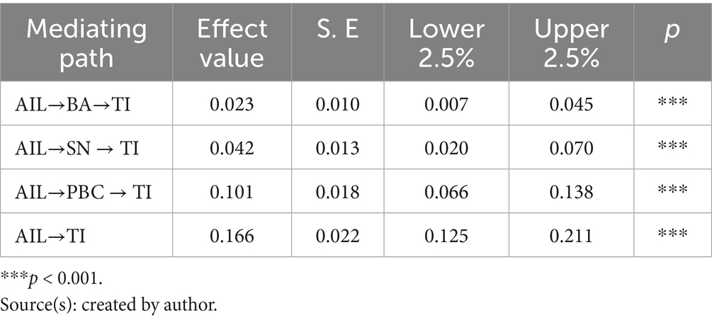 Using SmartPLS, the mediation effects of behavioral attitude (BA), subjective norm (SN), and perceived behavioral control (PBC) in the relationship between AI literacy (AIL) and teaching innovation (TI) were tested based on 5,000 bootstrap samples. According to Hayes (2009), indirect effects are considered significant if the 95% confidence interval does not include zero. The results (Table 9) indicated that all three mediation paths were significant, with no confidence intervals crossing zero. Specifically, the indirect effect of AI literacy through BA was relatively small ( ), supporting H6a; the effect through SN was moderate ( ), supporting H6b; and the effect through PBC was the largest ( ), supporting H6c. Additionally, the direct effect of AI literacy on TI remained significant ( ), indicating that BA, SN, and PBC partially mediate the relationship between AI literacy and teaching innovation. These findings confirm Ramnarain et al. (2024), suggesting that AI literacy not only directly enhances teachers’ innovation inclination but also indirectly boosts innovation momentum through multiple psychological mechanisms (attitudes, norms, control beliefs).