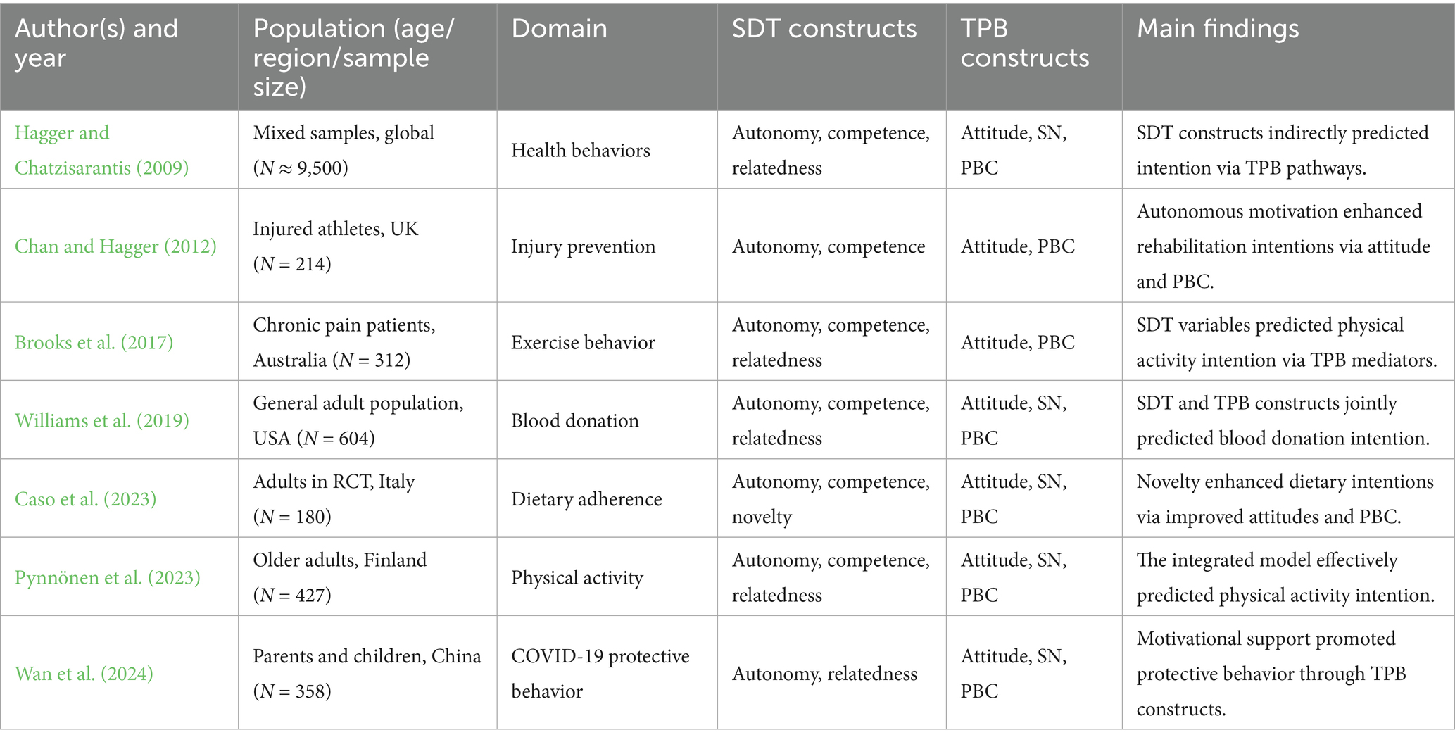 Researchers have increasingly integrated SDT and TPB to provide a comprehensive understanding of both motivational depth and cognitive specificity in health-related behaviors. The seminal meta-analysis by Hagger and Chatzisarantis (2009) demonstrated that SDT’s constructs of autonomy, competence, and relatedness indirectly predict behavioral intentions through the mediating effects of TPB variables such as attitude, subjective norms, and perceived behavioral control. Similar results have been observed across domains, including injury prevention (Chan and Hagger, 2012), chronic illness management (Brooks et al., 2017), and voluntary health actions such as blood donation (Williams et al., 2019). More recently, Caso et al. (2023) expanded the framework by integrating novelty into dietary interventions, demonstrating that novelty enhances adherence intentions through improved attitudes and perceived control. Pynnönen et al. (2023) and Wan et al. (2024) further confirmed that the combined SDT–TPB model effectively predicts behavioral intentions in physical activity and public health contexts (see Table 1).