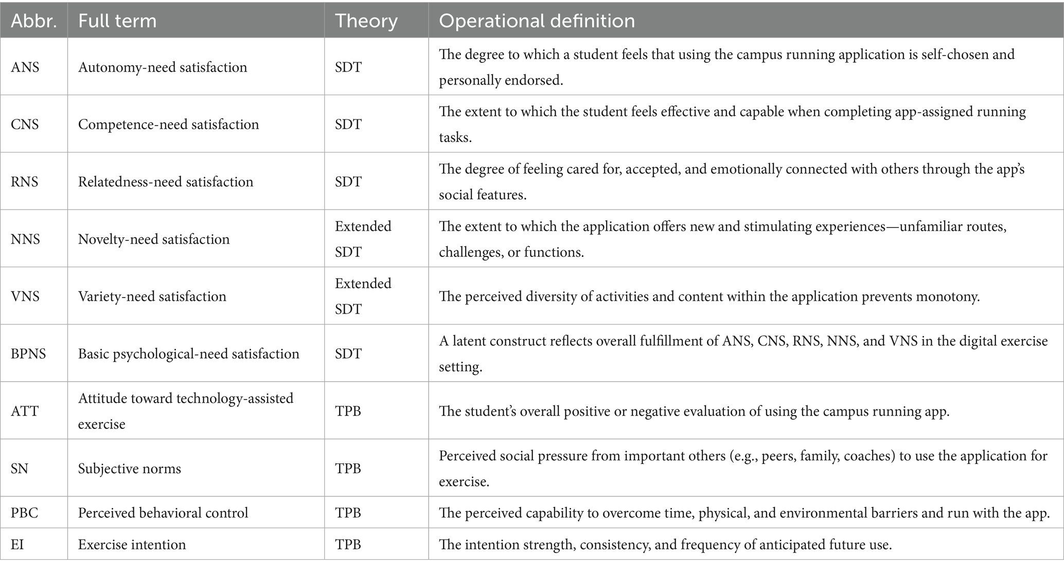 Existing theoretical frameworks offer only partial explanations. The Theory of Planned Behavior (TPB) effectively captures cognitive predictors such as attitude, subjective norms, and perceived behavioral control, but it tends to overlook the intrinsic motivational processes that energize and sustain behavior (Ajzen, 1991). Conversely, Self-Determination Theory (SDT) elucidates how satisfaction of autonomy, competence, and relatedness fosters self-driven engagement, but it lacks specificity in predicting intention formation within structured digital contexts (Deci and Ryan, 2000). Therefore, integrating these two perspectives allows for a more comprehensive understanding of both motivational quality and intentional control in students’ digital exercise behavior.