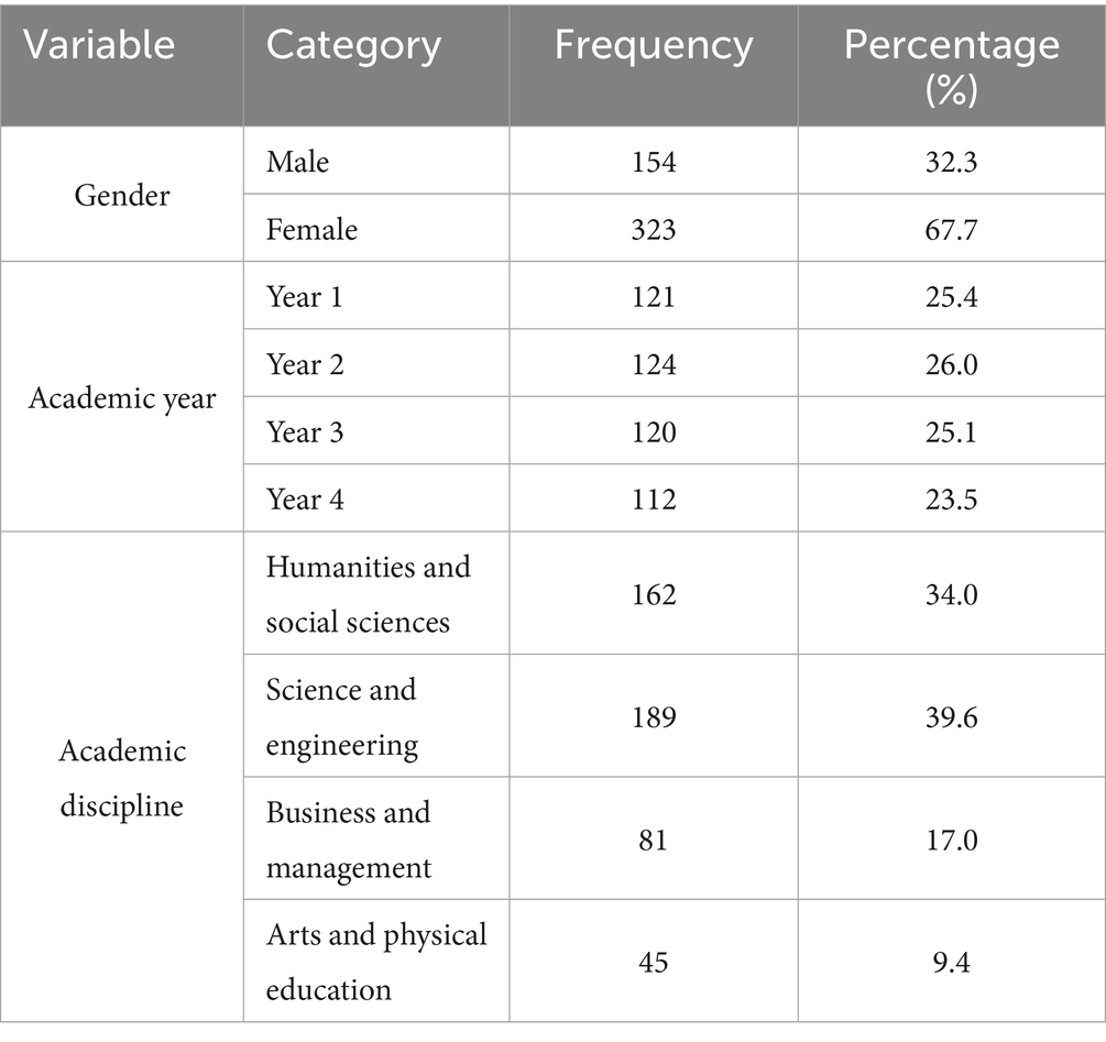 This study adopted a purposive sampling strategy targeting full-time undergraduate students who had prior experience using campus running check-in applications, a form of technology-assisted exercise widely implemented in Chinese universities. A total of 500 questionnaires were distributed across 5 comprehensive universities in Shanxi Province, China, through recruitment volunteers on the universities’ intranets and bulletin boards, and filled out online questionnaire links using the Wenjuanxing platform. Recruitment information included survey invitations, consent forms, researchers’ contact details, and a QR code link to an electronic questionnaire. To ensure the uniformity of the sample distribution, 25 students were recruited for each grade at each university. Of the total distributed questionnaires, 491 were returned, and after screening for incomplete responses and invalid cases (n = 14), 477 valid responses were retained for data analysis, resulting in a valid response rate of 95.4 percent.