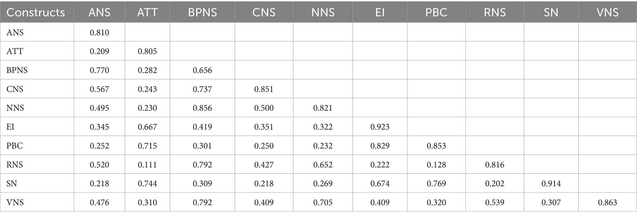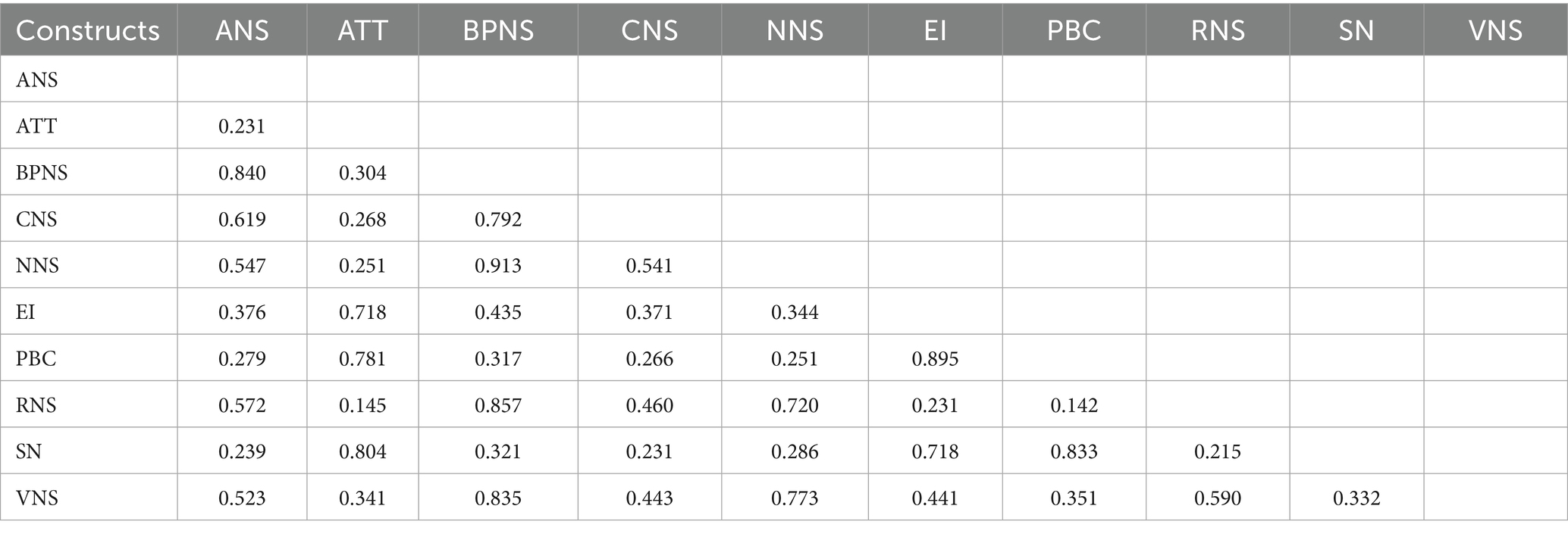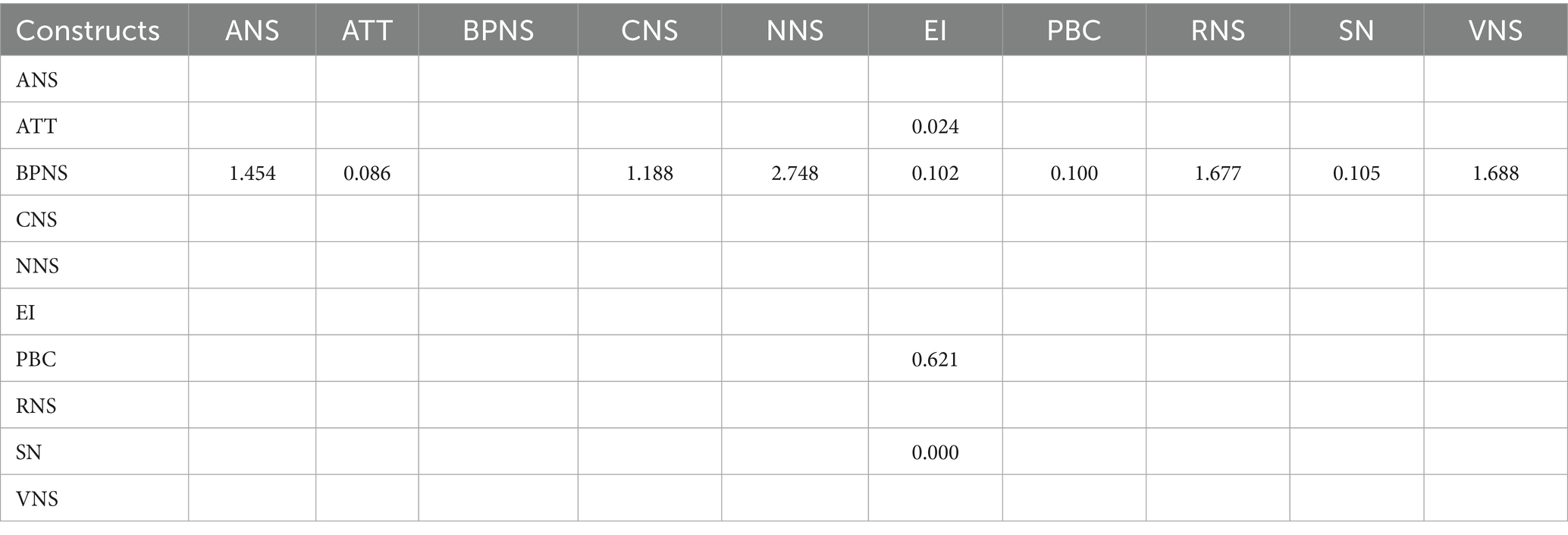 A few constructs show relatively higher correlations (Table 6), such as EI and PBC (0.895) and BPNS and RNS (0.857), but these remain within acceptable limits, reflecting conceptual connections without compromising their distinctiveness (Henseler et al., 2015). In particular, the HTMT value between the BPNS and NNS is 0.913, which can be retained in order not to affect model validity (Franke and Sarstedt, 2019). In summary, the HTMT analysis confirms adequate discriminant validity across all constructions. Despite some moderate correlations, all values remain within acceptable thresholds, validating the measurement model’s robustness and ensuring that each construction is conceptually distinct.