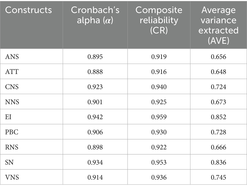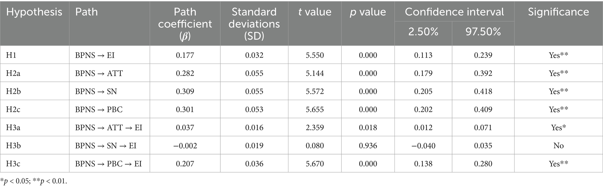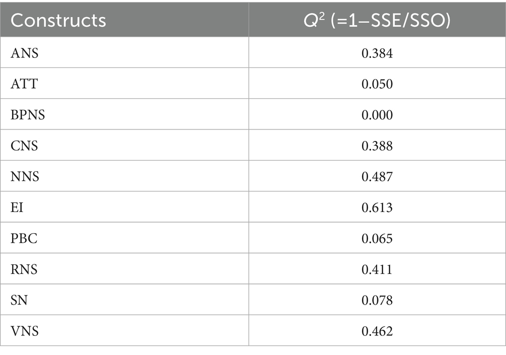 A few constructs show relatively higher correlations (Table 6), such as EI and PBC (0.895) and BPNS and RNS (0.857), but these remain within acceptable limits, reflecting conceptual connections without compromising their distinctiveness (Henseler et al., 2015). In particular, the HTMT value between the BPNS and NNS is 0.913, which can be retained in order not to affect model validity (Franke and Sarstedt, 2019). In summary, the HTMT analysis confirms adequate discriminant validity across all constructions. Despite some moderate correlations, all values remain within acceptable thresholds, validating the measurement model’s robustness and ensuring that each construction is conceptually distinct.