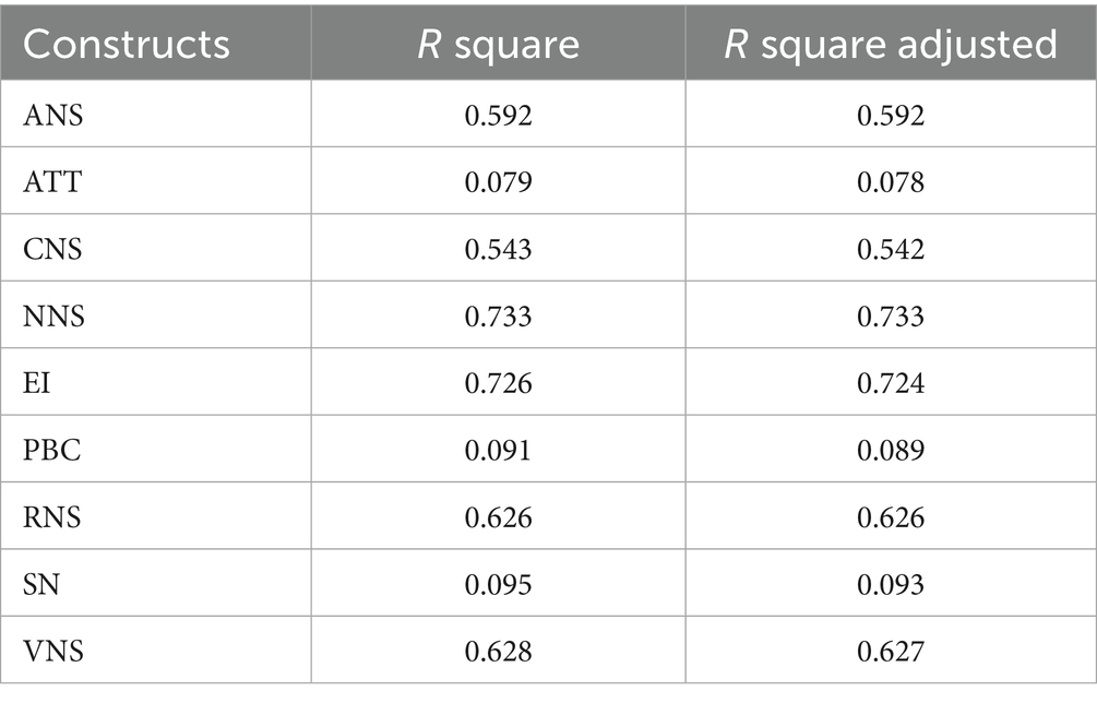 In contrast, the constructs attitude (ATT), subjective norms (SN), and perceived behavioral control (PBC) have relatively low R2 values. For instance, attitude (ATT) has an R2 of 0.079 (Adjusted R2 value = 0.078), while subjective norms (SN) and perceived behavioral control (PBC) show R2 values of 0.095 and 0.091, respectively, with slightly lower Adjusted R2 values. These results suggest that while basic psychological need satisfaction (BPNS) has a direct influence on these constructions, other unmeasured factors may also contribute to their variance.