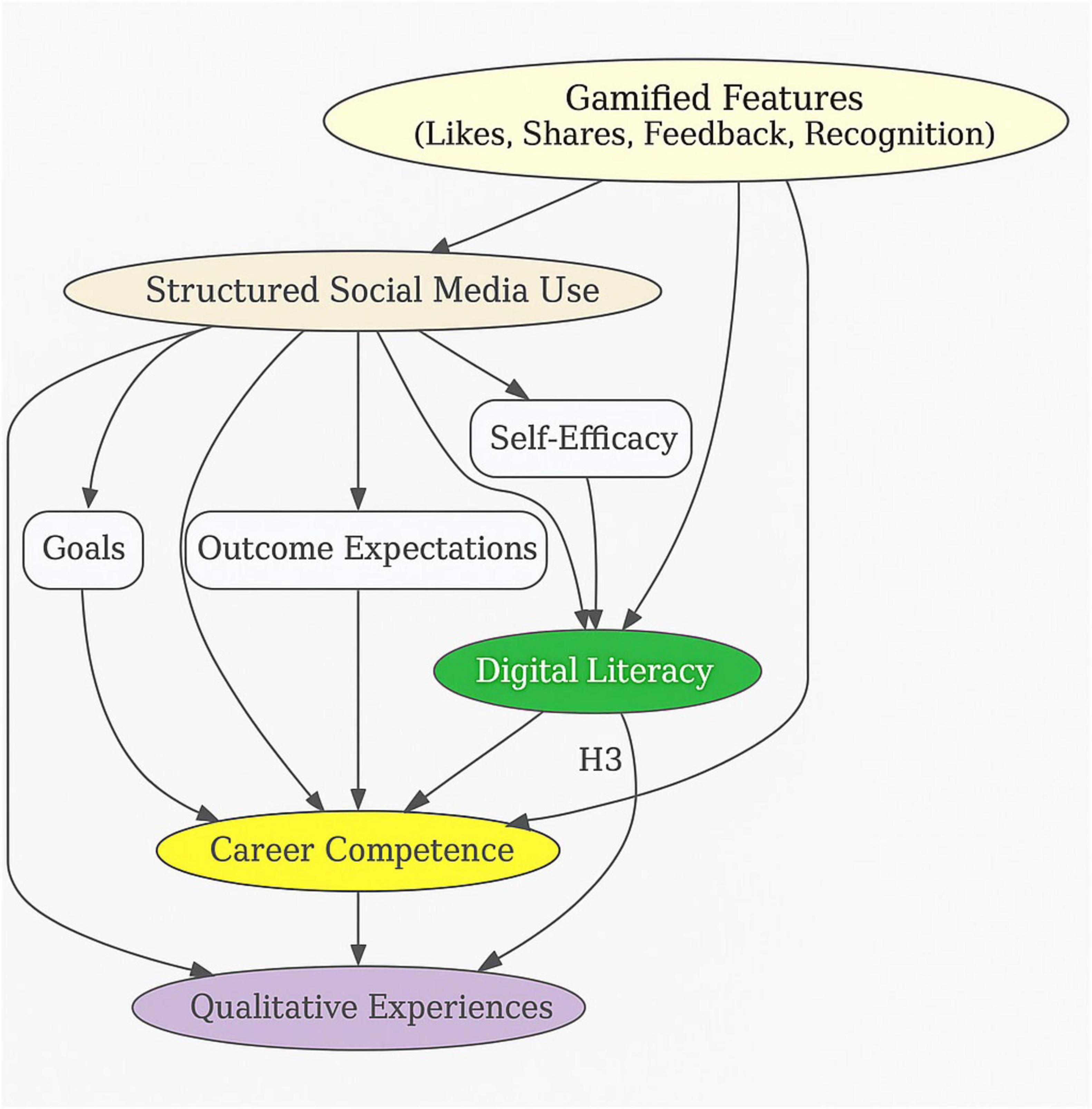 The formulation of research hypotheses is central to establishing the logical bridge between theory and empirical investigation. In this study, hypotheses are developed based on Social Cognitive Career Theory (SCCT) (Lent et al., 1994) and gamified learning theory (Deterding et al., 2011). SCCT emphasizes the roles of self-efficacy, outcome expectations, and goals in shaping career-related behaviors, while gamified learning theory explains how interactive and feedback-rich digital environments foster sustained motivation and skill development. Together, these frameworks provide complementary perspectives for understanding how social media engagement can influence students’ digital literacy and career competence. In addition, prior empirical research on digital skills, social media use, and employability offers evidence to support the hypothesized relationships. The following subsections elaborate on the theoretical and empirical rationale for each hypothesis.
