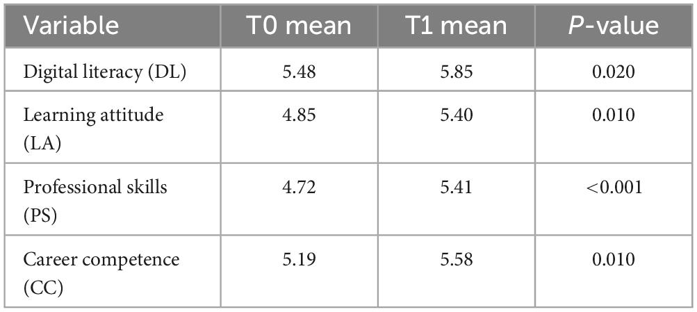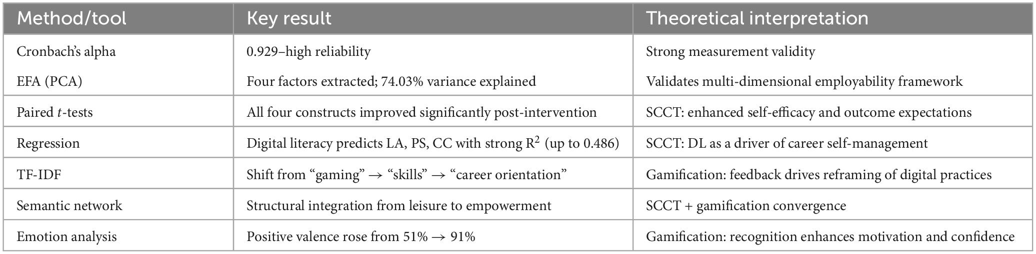 Results: Quantitative analyses revealed significant gains in digital literacy, professional skills, learning attitudes, and career competence. Digital literacy also emerged as a strong predictor of both professional skills and career competence. Complementary qualitative findings highlighted students’ enhanced self-regulation, stronger employability orientation, and a shift toward viewing social media as a professional rather than purely social tool.