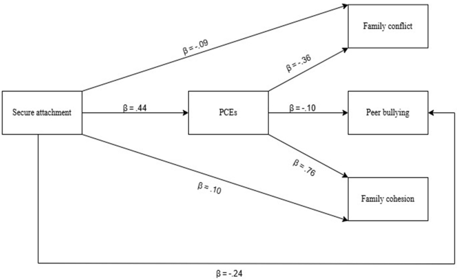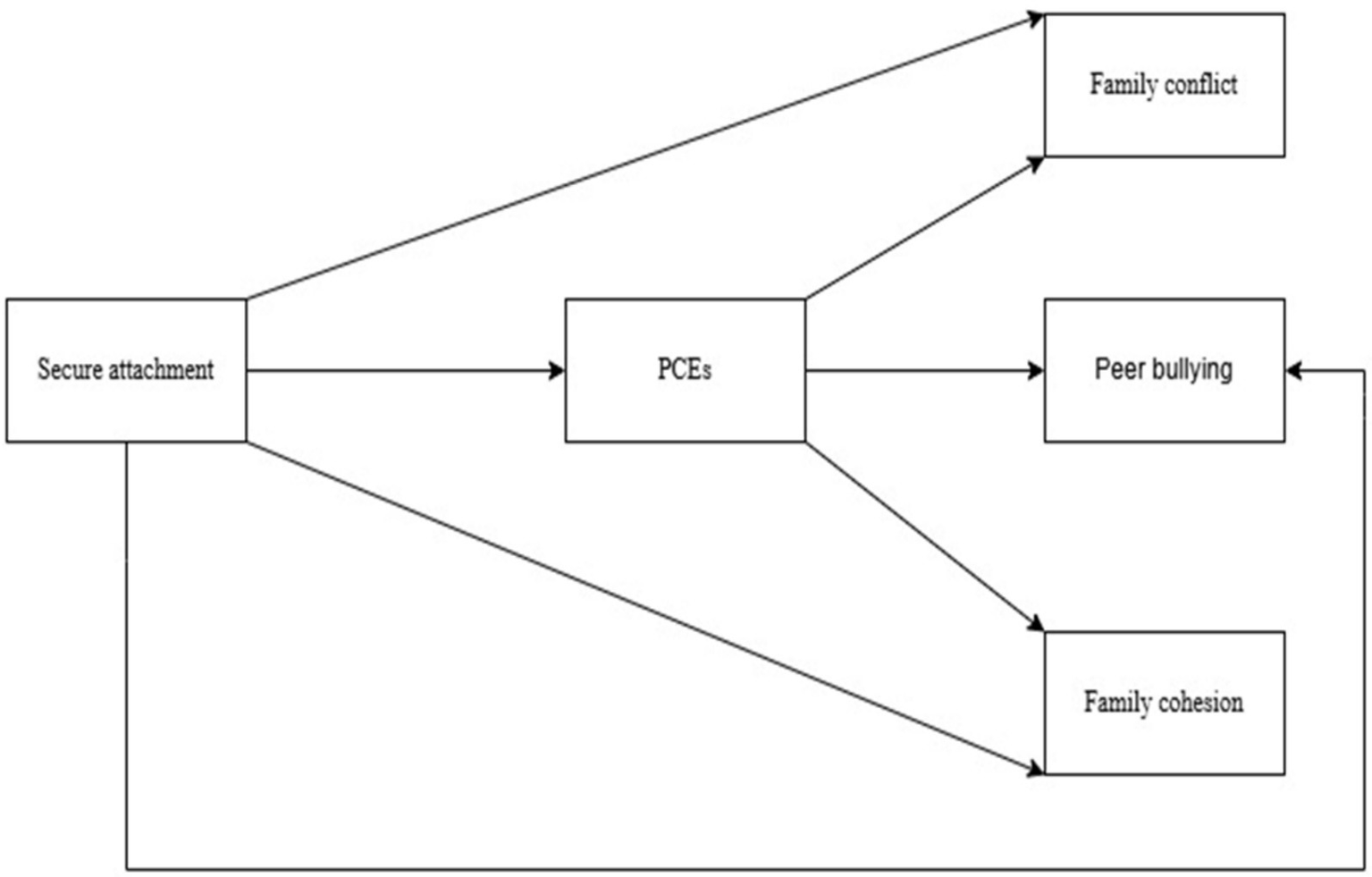 H3. PCEs will mediate the relationship between secure attachment and family conflict, peer bullying, and family cohesion.