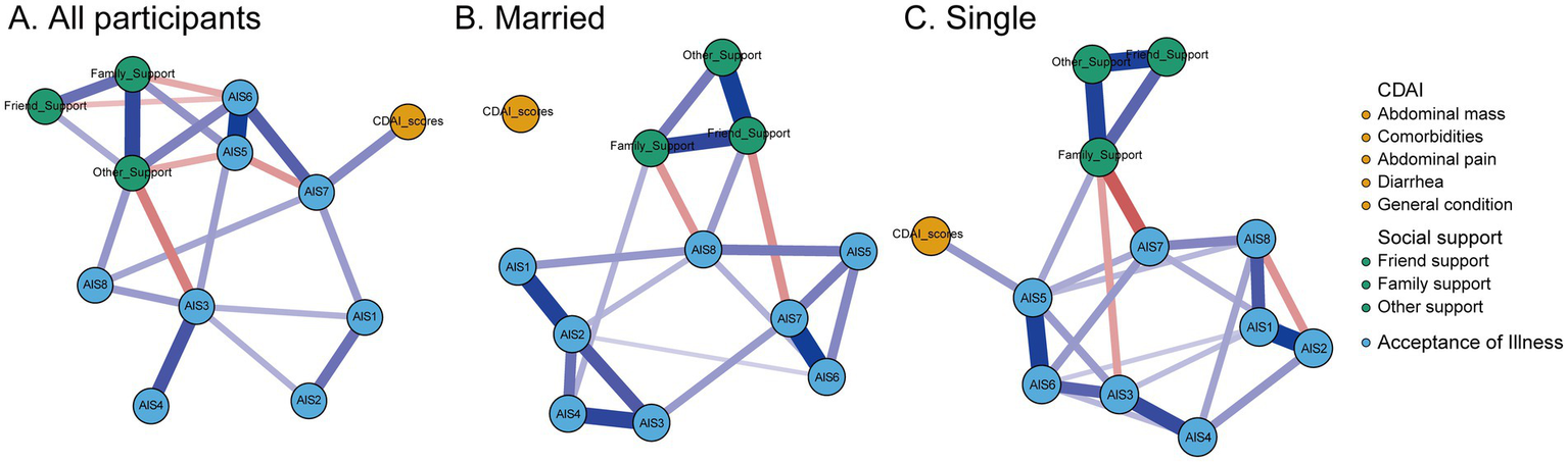 In a cross-sectional design, 276 CD patients completed standardized assessments, including the Multidimensional Scale of Perceived Social Support (MSPSS), the Acceptance of Illness Scale (AIS), and the Crohn’s Disease Activity Index (CDAI). A regularized partial correlation network was estimated using the graphical LASSO algorithm, with centrality and bridge strength metrics computed to identify influential variables. Subgroup analyses by marital status were conducted.