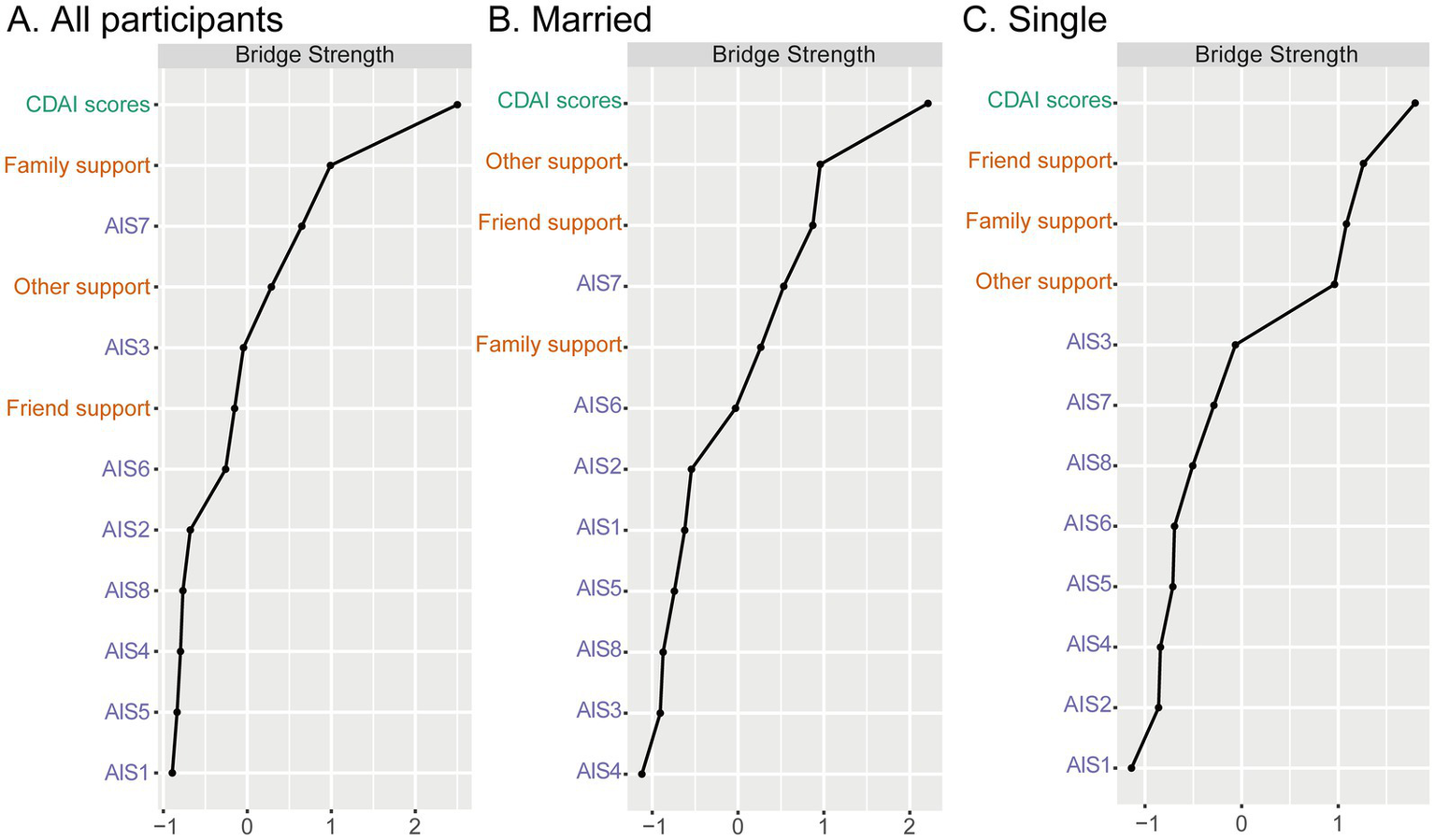 The network revealed key nodes with high centrality, including lack of self-worth (AIS7), feeling unneeded (AIS3), and lack of self-sufficiency (AIS6), along with perceived support from significant others. Bridge centrality analysis identified AIS7, family support, and overall disease activity as key bridging nodes connecting psychosocial and clinical domains. Subgroup analysis revealed distinct patterns: in single patients, family support and self-worth were directly linked to disease activity; in married patients, friend support and autonomy emerged as central, with no direct psychosocial-clinical links. Network structures did not significantly differ in global strength, but key node positions varied by marital status.