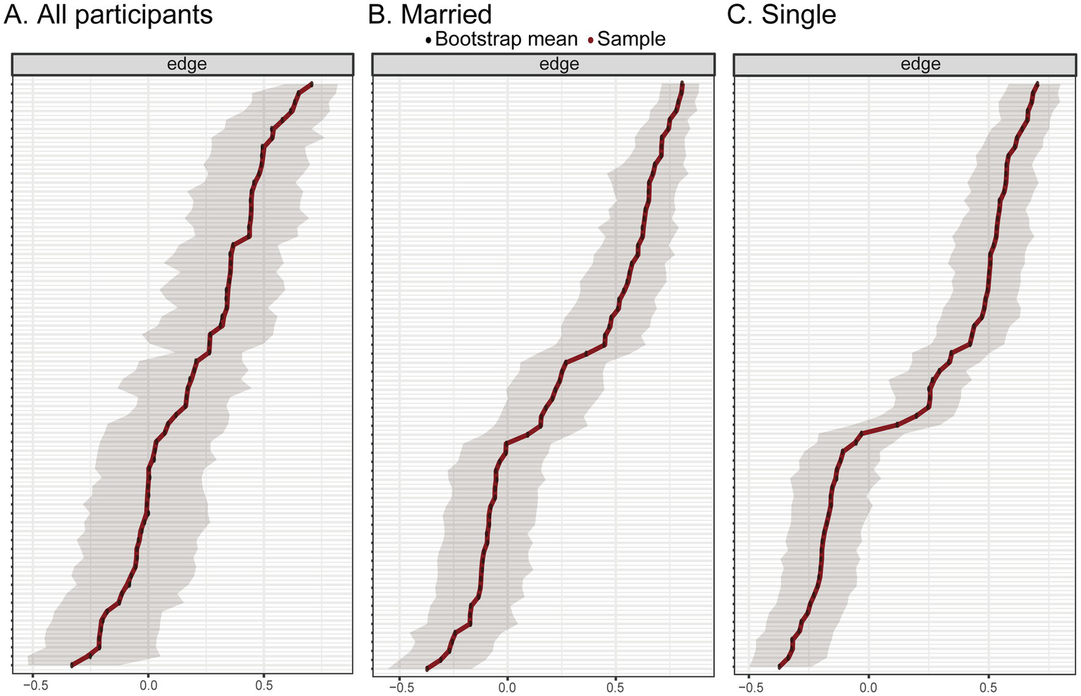 To further investigate the influence of marital status, subgroup analyses were conducted separately for married (n = 106) and single (n = 170) participants. Distinct network configurations emerged across these two groups.