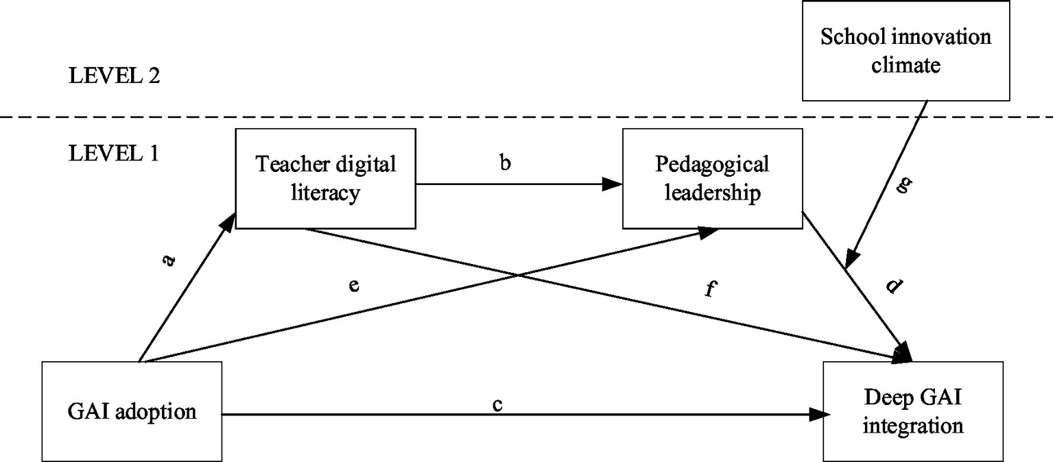 Our model thus aims to empirically test how these systems dynamically interact, with individual pathways being either enabled or constrained by the surrounding organizational context. Specifically, we define the individual teacher’s attributes and developmental process (GAI adoption, digital literacy, pedagogical leadership, and deep integration) as Level-1 factors. We conceptualize the school’s organizational characteristics, represented by the innovation climate, as a Level-2 factor that influences these individual-level processes.