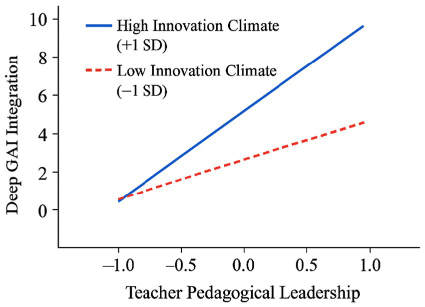 H5: The school’s innovation climate moderates the positive relationship between teacher pedagogical leadership and deep GAI integration, such that the relationship is stronger in schools with a more supportive innovation climate.