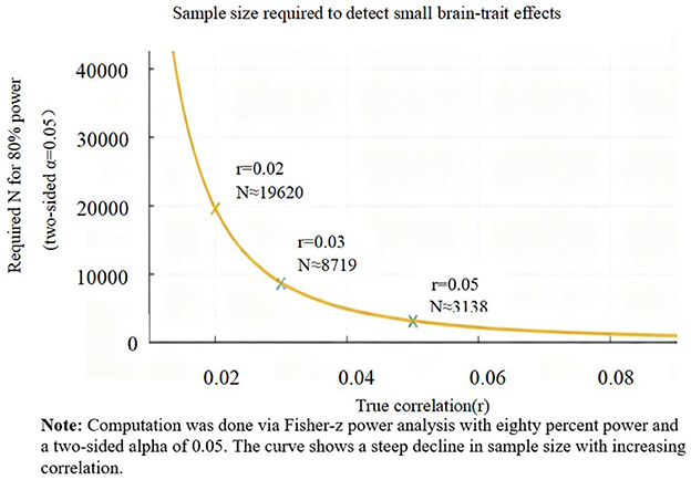 Comprehensive investigations have found little to no evidence of robust brain–personality associations in large samples. For instance, Avinun et al. (2020) examined 1,107 individuals and reported no significant relationships between Big Five traits and multiple measures of brain morphometry. A systematic review and meta-analysis reached a similar conclusion, summarizing that there are no replicable structural brain differences as a function of Big Five traits (Chen and Canli, 2022). These results suggest that true associations, if present, are extremely small in magnitude. Power analyses and empirical work converge on the same message: detecting such tiny effects requires very large samples. Marek et al. (2022) showed that typical brain-wide association studies require thousands of subjects for reproducibility. Figure 1 illustrates this relationship: as effect size decreases, the sample size needed for 80% statistical power rises steeply. In practice, most historical studies in personality neuroscience were far too small, yielding underpowered analyses and spurious positives (Yarkoni, 2009; Button et al., 2013).