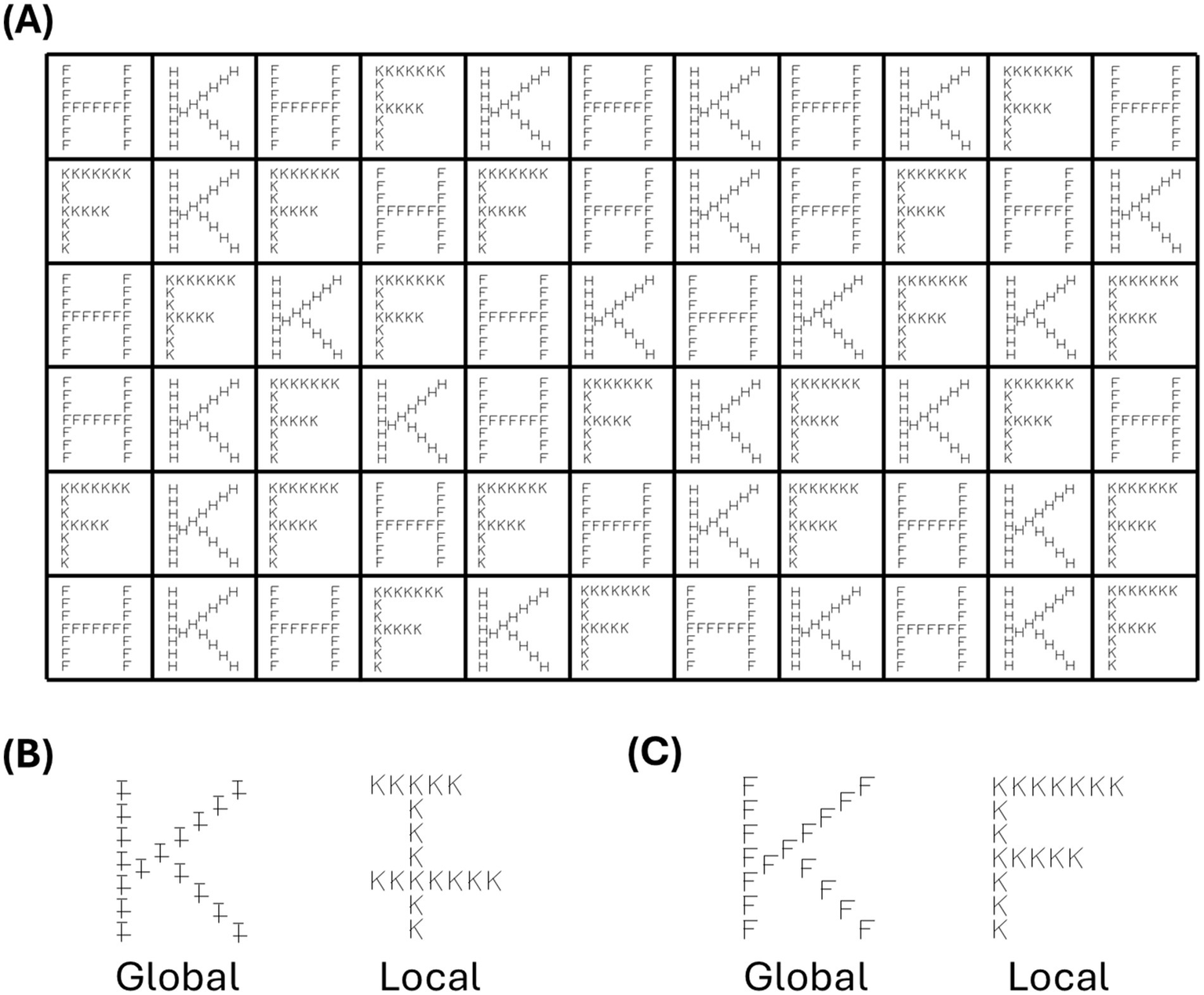 Presentations of the stimuli. The trials, an example of which is shown in interferent (A), consist of 66 stimuli (6 rows and 11 columns), delimited by boxes. The stimuli can be neutral (B), i.e., with a single nameable level (global or local), or interfering (C), i.e., with two nameable levels (global and local).
