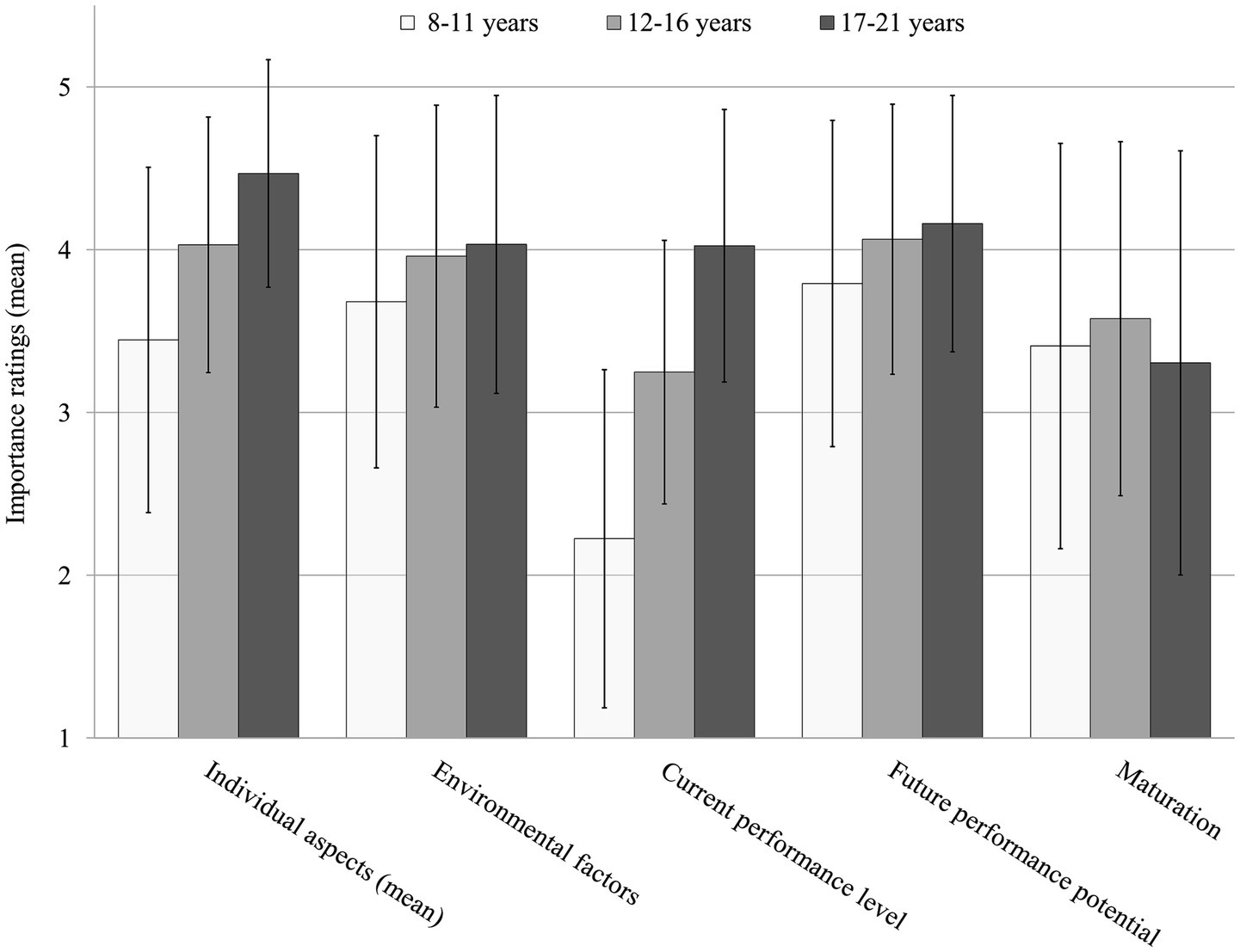 Table 1 shows the importance ratings for variables individual aspects (mean), environmental factors, current performance level, future performance potential, and maturation differentiated for the three age groups. Given statistically significant Mauchly tests, the F-values for all analyses were Grennhouse-Geisser adjusted.