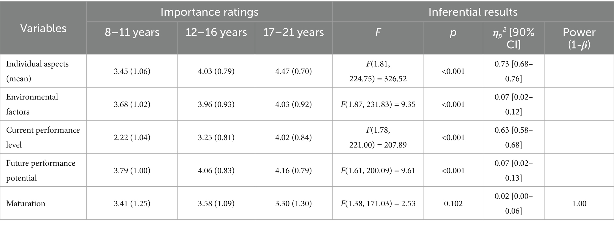 Inferential RM-ANOVA results showed statistically significant differences for all items but maturation (p = 0.102) with large effects for variables individual aspects (mean) and current performance level and medium effects for future performance potential and environmental factors (see Table 1). That is, the latter four variables showed statistically significant and practically relevant differences for the different age groups.