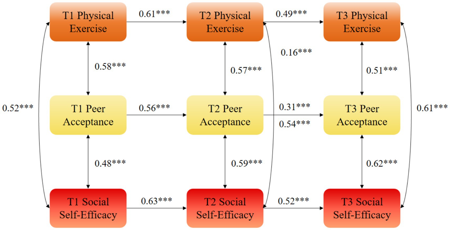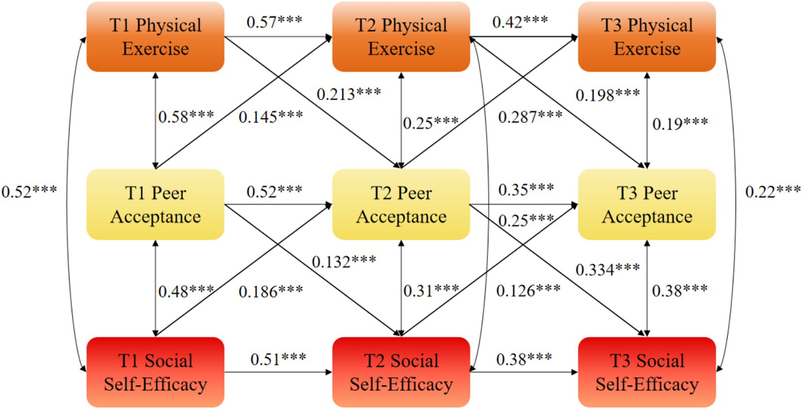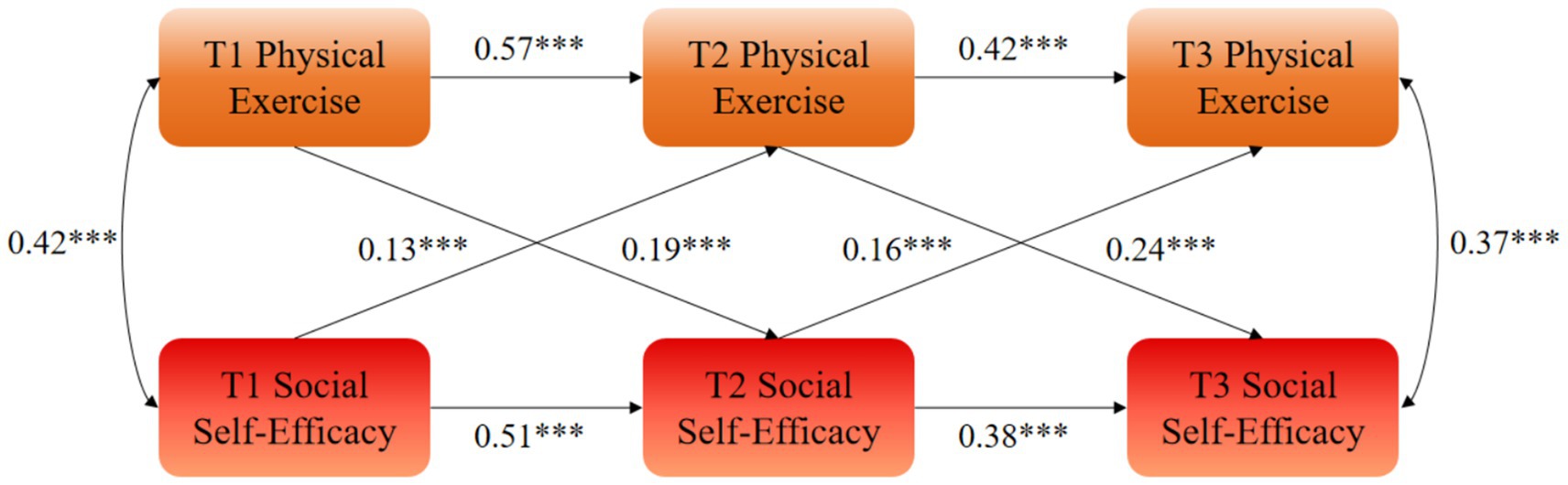 The autoregressive effects indicated that physical exercise at a prior measurement (Tn) significantly predicted physical exercise at the subsequent measurement (Tn + 1), and that social self-efficacy at a Tn significantly predicted social self-efficacy at the subsequent measurement. Specifically, T1 physical exercise significantly and positively predicted T2 physical exercise (β = 0.57, p < 0.01), and T2 physical exercise significantly predicted T3 physical exercise (β = 0.42, p < 0.01). Similarly, T1 social self-efficacy significantly predicted T2 social self-efficacy (β = 0.51, p < 0.01), and T2 social self-efficacy significantly predicted T3 social self-efficacy (β = 0.38, p < 0.01).